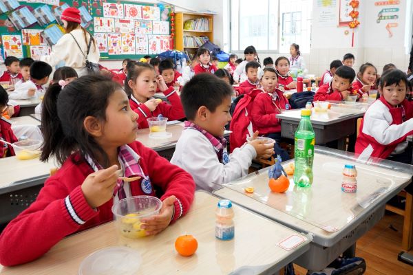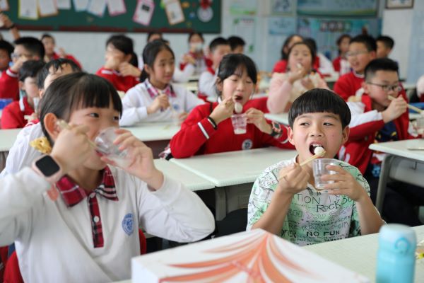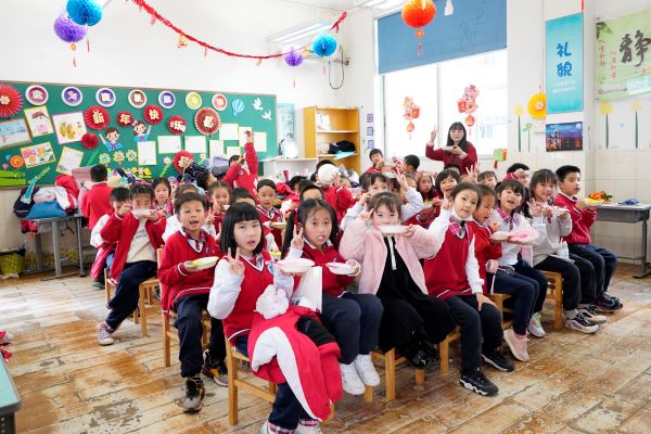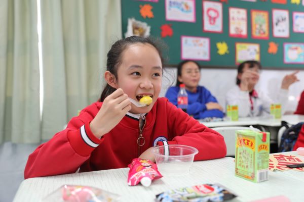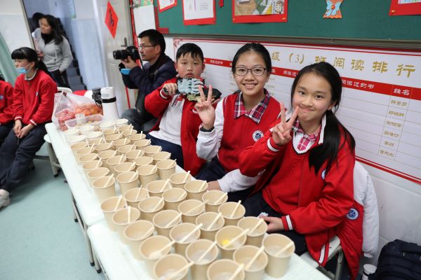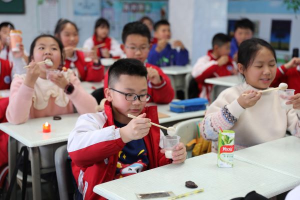 就在孩子们还在操场狂欢的时候,老师和家委们早已煮好一碗碗热气腾腾的汤圆,孩子们进了教室就有美味可以品尝,现场无比的温馨和欢乐。