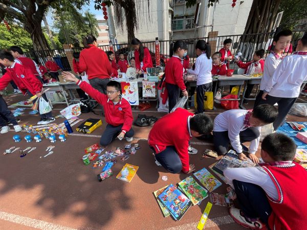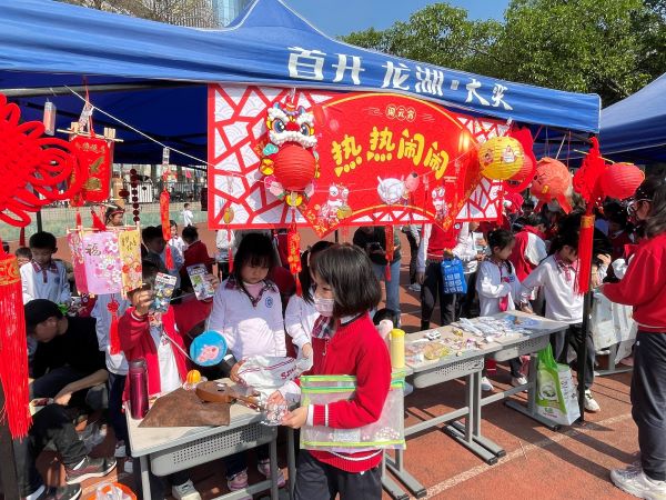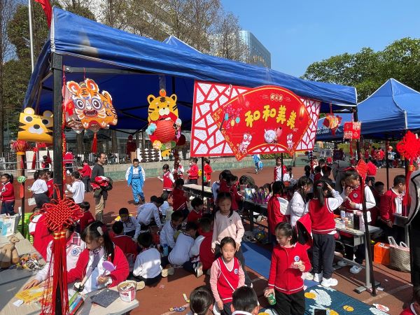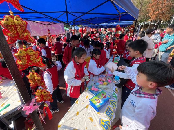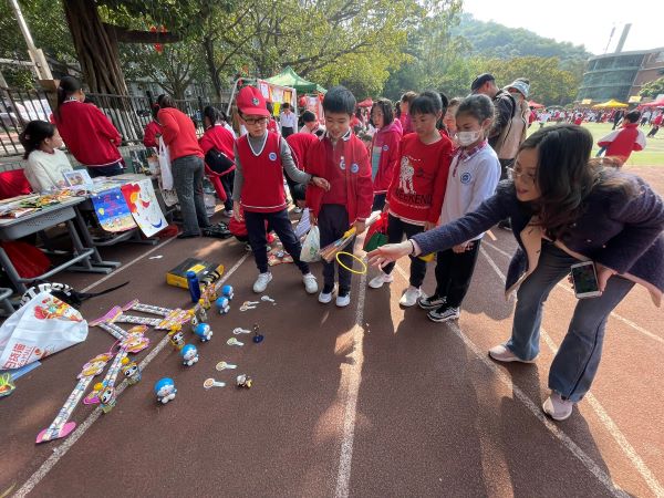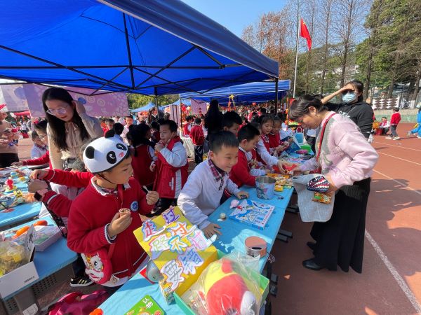 活动在大操场进行,现场商品种类繁多,有书本文具、小食饮品、益智玩具、手工作品等。孩子们守着自己的摊位卖力的推销,也有比较活络的“商贩”,游走在市集,伺机寻找顾客兜售手里的商品,特别是遇到学校的老师或者领导,需不需要也想要关照一下他们的小本生意。值得一提的是,很多摊位居然也支持手机扫码支付。当积累一定的资本之后,小老板们也开始逛起市集来,每个人都兴高采烈、满载而归。