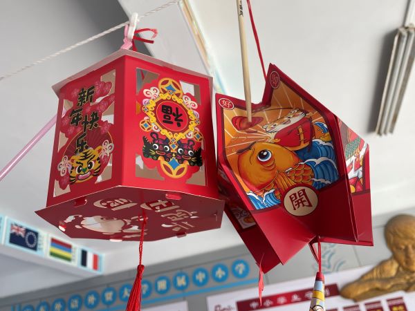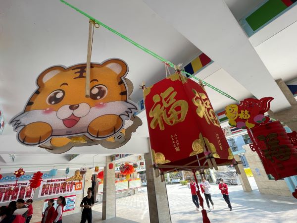 同学们春节在家里也做了很多形式各异的灯笼,在元宵节这一天,张挂在学校的门口,形成一道亮丽的风景。