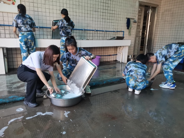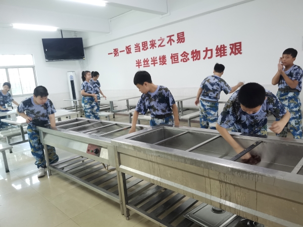 餐后同学们共同打扫食堂卫生,人人参与擦桌子、拖地、洗盆子等,娴熟地洗涮、清理。他们真是一群自信满满、能力卓越的少年。