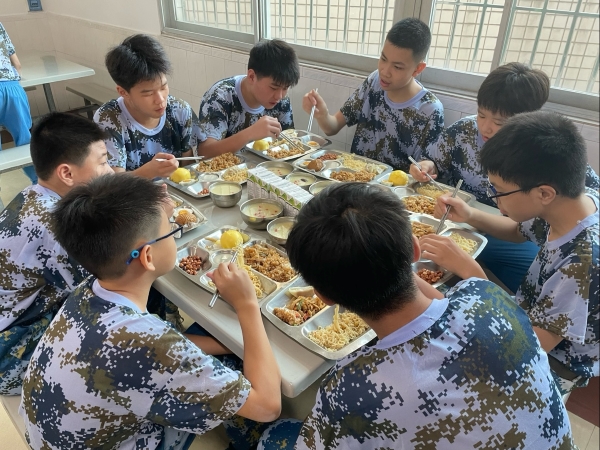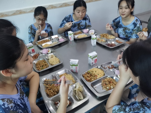 结束每半天的训练后,同学们有序地用餐。食堂饭菜口味多样,营养丰富均衡且色香味俱全,大家都吃得很开心。