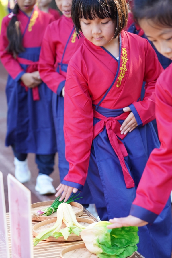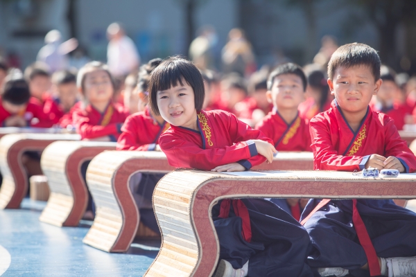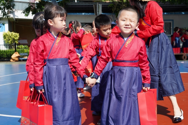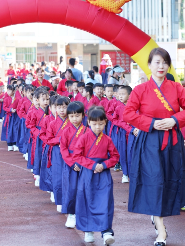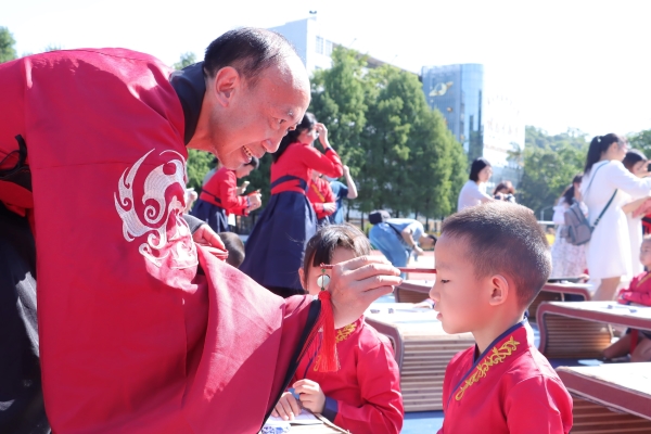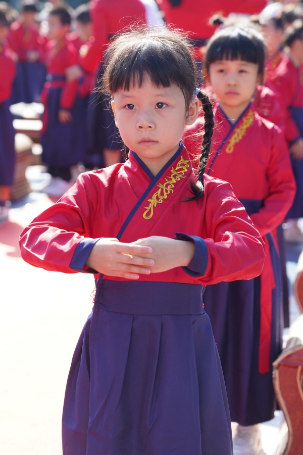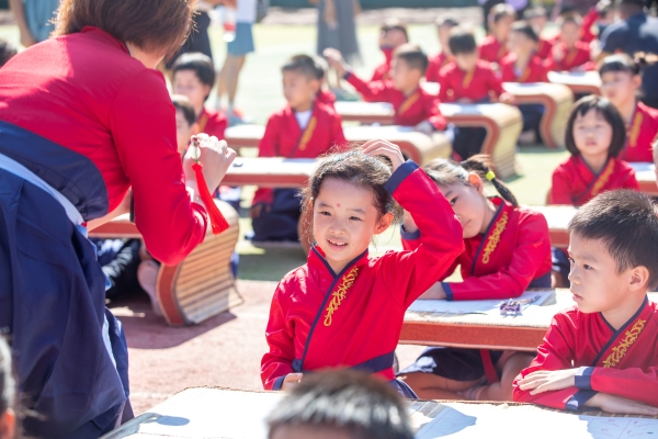 童蒙之学,始于衣冠;先正衣冠,后明事理。穿戴整洁,更能展示一个人良好的精神面貌。一年级的小朋友们面带笑容、精神饱满地整理好自己的衣冠,在老师的带领下齐步迈入开笔礼仪式现场。