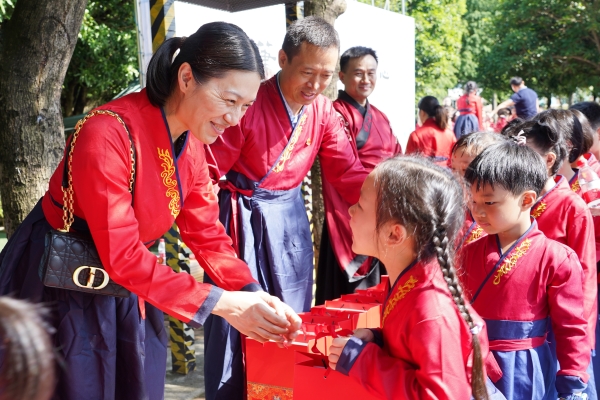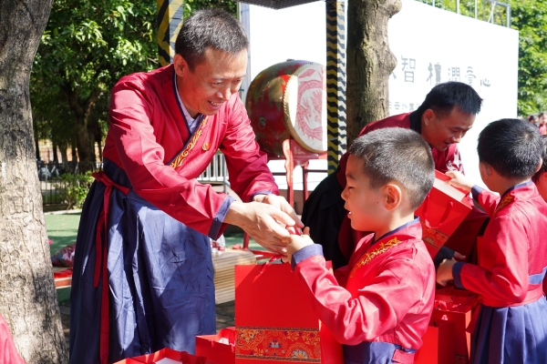 黄哲昙校长助理祝贺一年级的小朋友们正式成为一名小学生,她希望同学们能在中国传统文化的浸润中,学会亲圣贤、亲师长、亲友人、亲学校、亲祖国,“爱众亲仁,乐学笃行”,做有理想,有道德,有文化,有纪律的人。