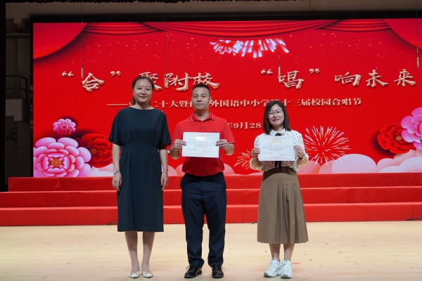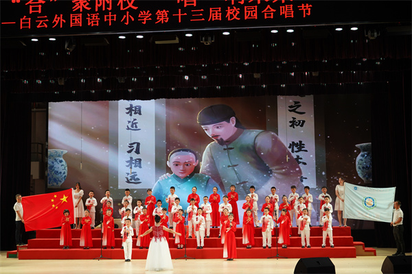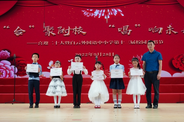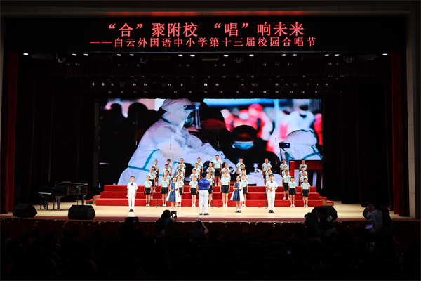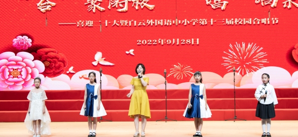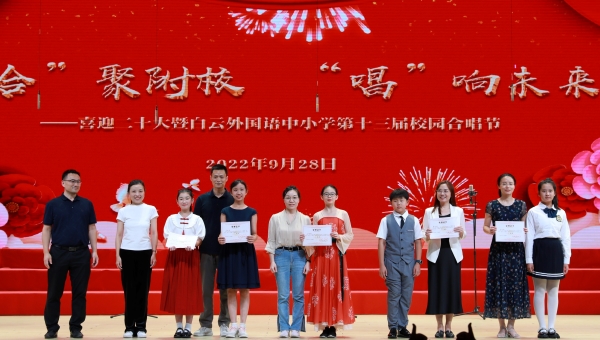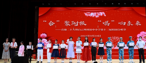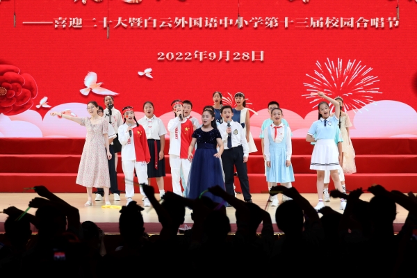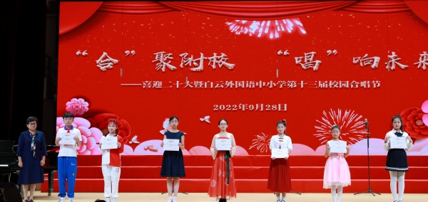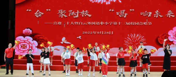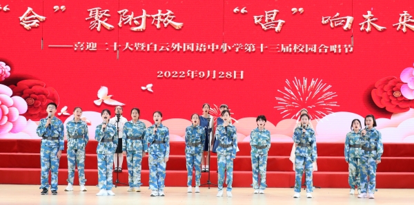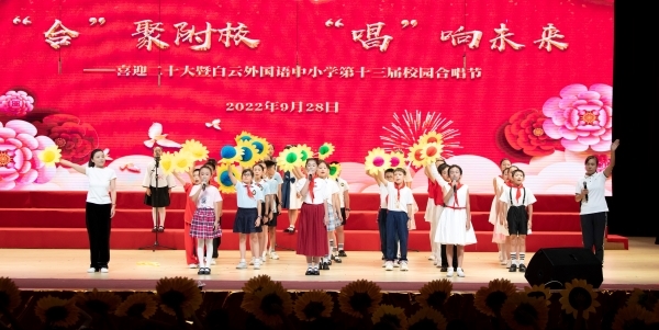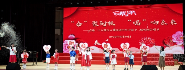 为迎接党的二十大胜利召开,庆祝中华人民共和国成立73周年,丰富校园文化生活,陶冶学生高尚情操,加强学生爱国、爱校、爱班教育,增强班级的凝聚力,推进我校活动育人的特色建设,2022年9月28日,我校在广外云山会堂举行了“合”聚附校,“唱”响未来 ——喜迎二十大暨白云外国语中小学第十三届校园合唱节。