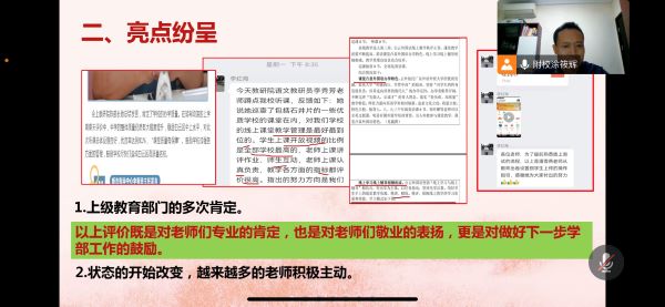 涂书记从教学与教务、学生管理和防控三个方面进行了总结,肯定了网课期间老师的上课质量,还得到了区教研院教研员的好评。各科任老师之间的配合度也越来越高,学生管理也更加有序,同时也提醒老师们要做好自身与家人的防控,守护健康。倡导老师们有问题要及时沟通,不要把压力变成压抑,做好返校前的准备。