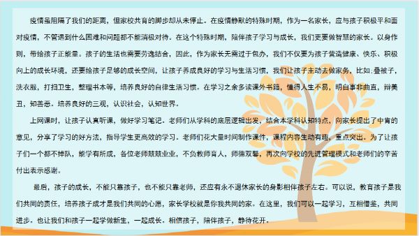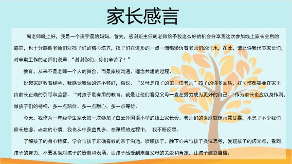 这次线上家长会给老师和家长们打造了很好的沟通平台,拉近了家校之间的距离,增强了家校之间的联结,明确了接下来家校共同努力的方向,达到了预期的效果。本次家长会已落下帷幕,但育人的道路我们一直走在路上,愿我们一同为学生保驾护航,向着更美好的远方携手前行。