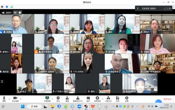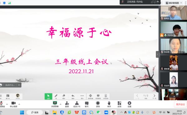 面对当前形势,我们迎来新的挑战。为了给老师们搭建交流的平台,分享快乐、传递幸福、相互学习、相伴前行,学生发展中心策划并组织各年级组教师开展线上会议。从2022年11月16日开始,各年级陆续举行了教师线上会议。黄哲昙校长助理、学生发展中心郑文静主任、梁海文副主任,课程教学中心唐龄主任、刘欣副主任一起参加了各年级会议并发言。