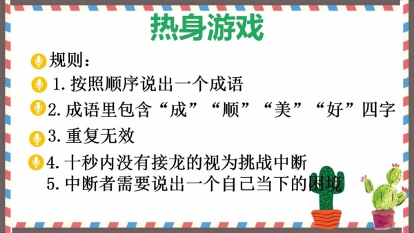 讲座开始,刘老师从热身游戏——成语接龙送祝福导入,学生们热情高涨,积极参与,借着成语把美好的祝福送给所有人。