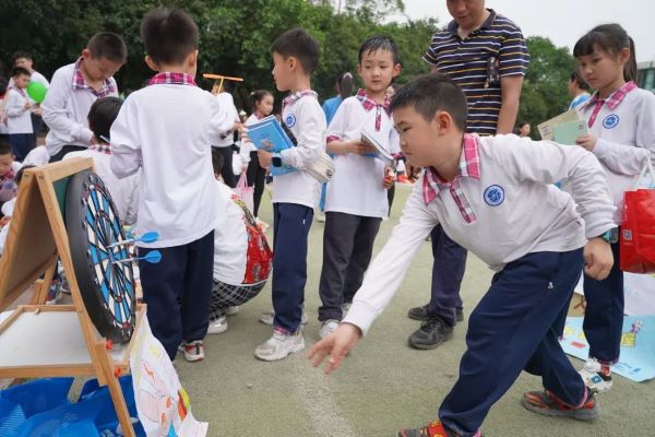 广播响起,孩子们排着整齐的队伍,怀抱着干净整洁的图书来到了操场,有的手里还攥着零钱,兴奋地奔向喜欢的摊位。为了招揽“生意”,小店主们集思广益,采用了多种多样的促销方式。现场有以书换书,悦读分享会,买书送糖果、送饮料、送书签、体验飞镖、抽奖、套圈圈等丰富的图书换购形式。