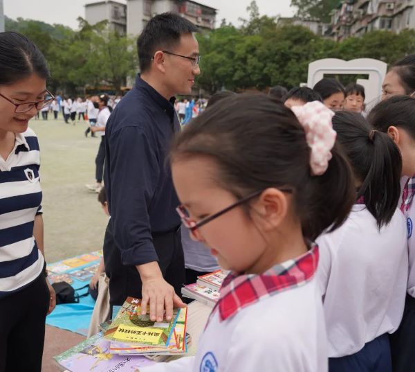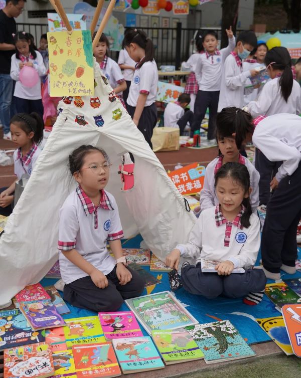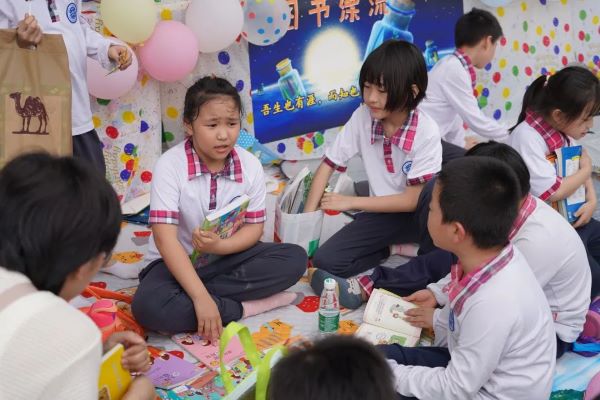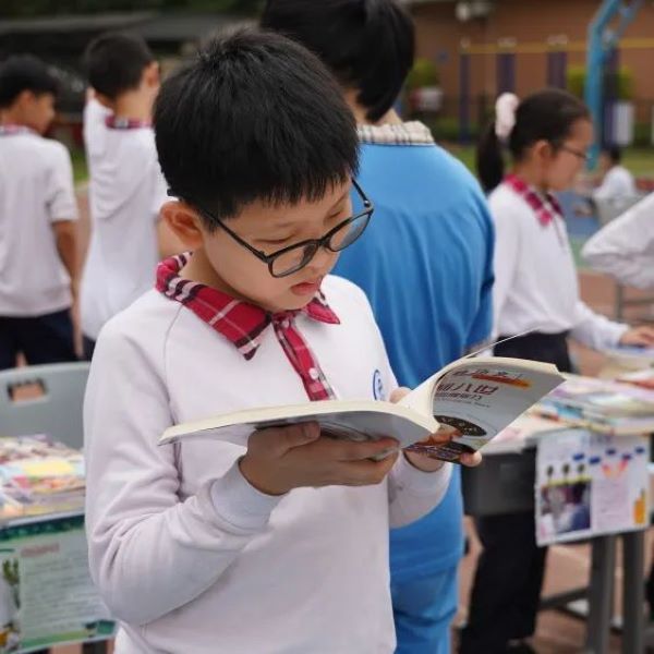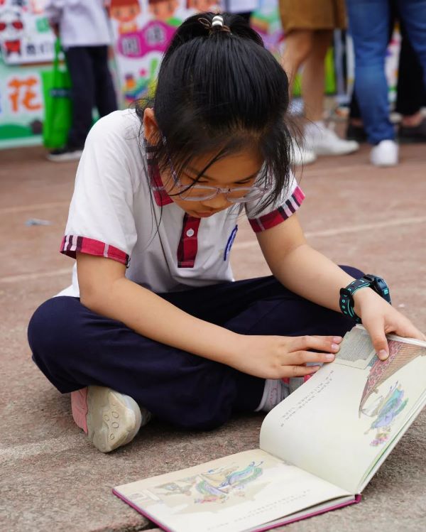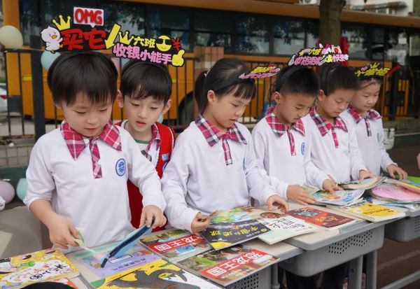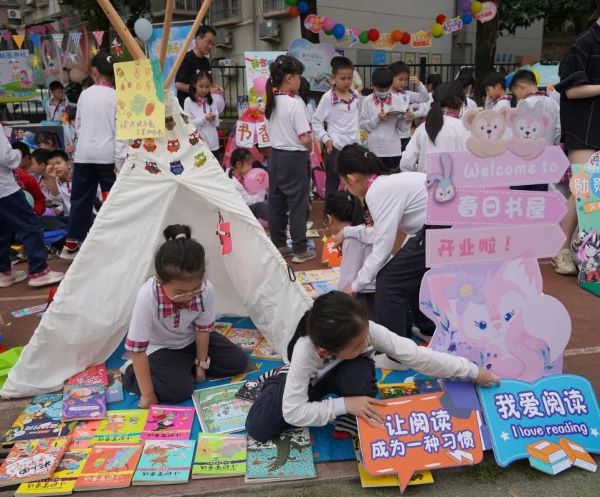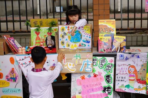 一本本崭新的书籍,可以看出同学们对书本的爱惜与爱护。琳琅满目的书籍静静地躺着桌子上、地上、书架上,等待着欣赏它的小主人出现,还有流动书摊,孩子们捧着书在操场上叫卖。