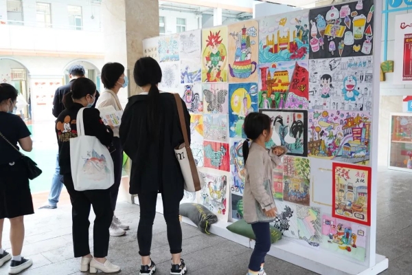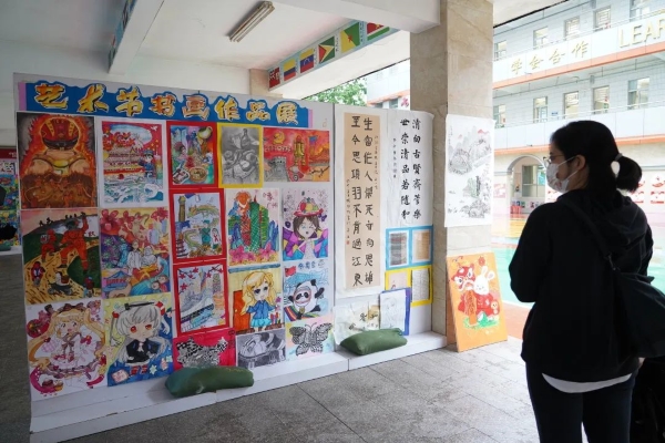 校园内随处可见优秀的书法、绘画作品展示,琳琅满目的作品吸引了诸多家长驻足欣赏。