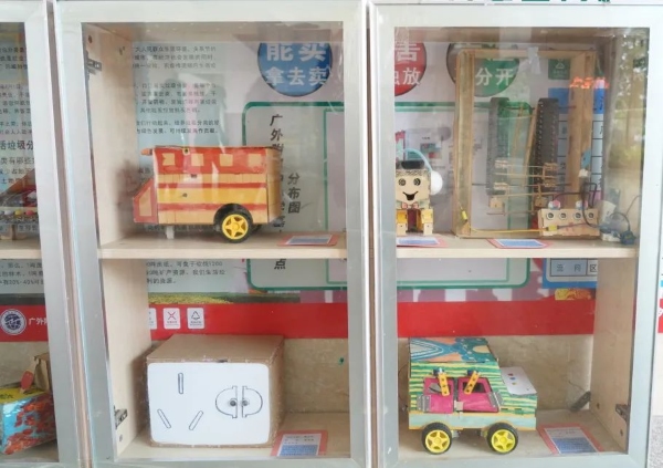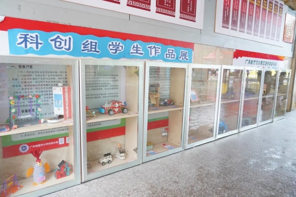 走进校门,映入眼帘的是一排排整齐的学生作品展览,有优秀的科创作品:投石机、小型电子钢琴、小型消防灭火车、避障机器人、安全警报系统等。