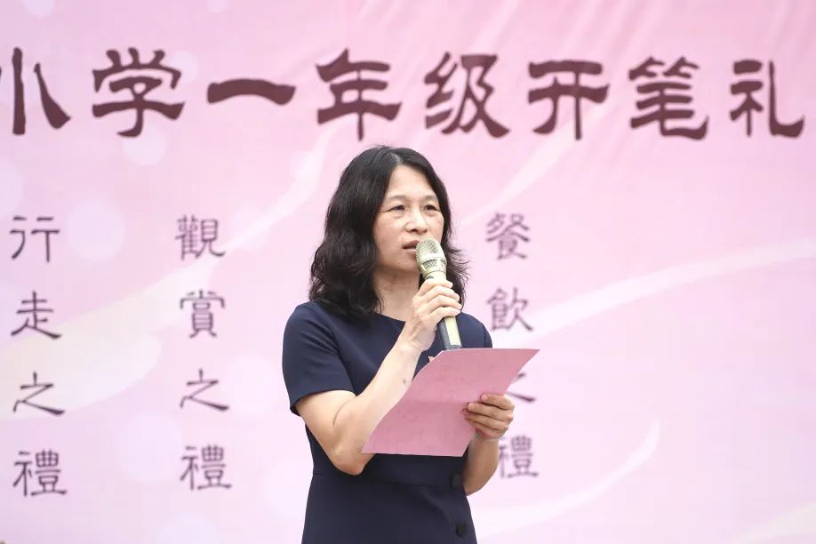 黄哲昙副校长欢迎三百多位小朋友加入白云外国语小学这个温暖的大家庭。她希望同学们能从庄重的开笔礼仪式中,真正感受到入学是人生中的一件大事,是开始学习走向成才的起点;希望以此激励同学们珍惜读书机会,崇德立志、勤学创新;希望同学们不仅要写好“人”字,还要学会做人,做一名遵纪守法、尊敬师长、热爱生命和德智体美劳全面发展的人。愿同学们通过今天的开笔礼,走出学习的第一步,走好人生的每一步!
