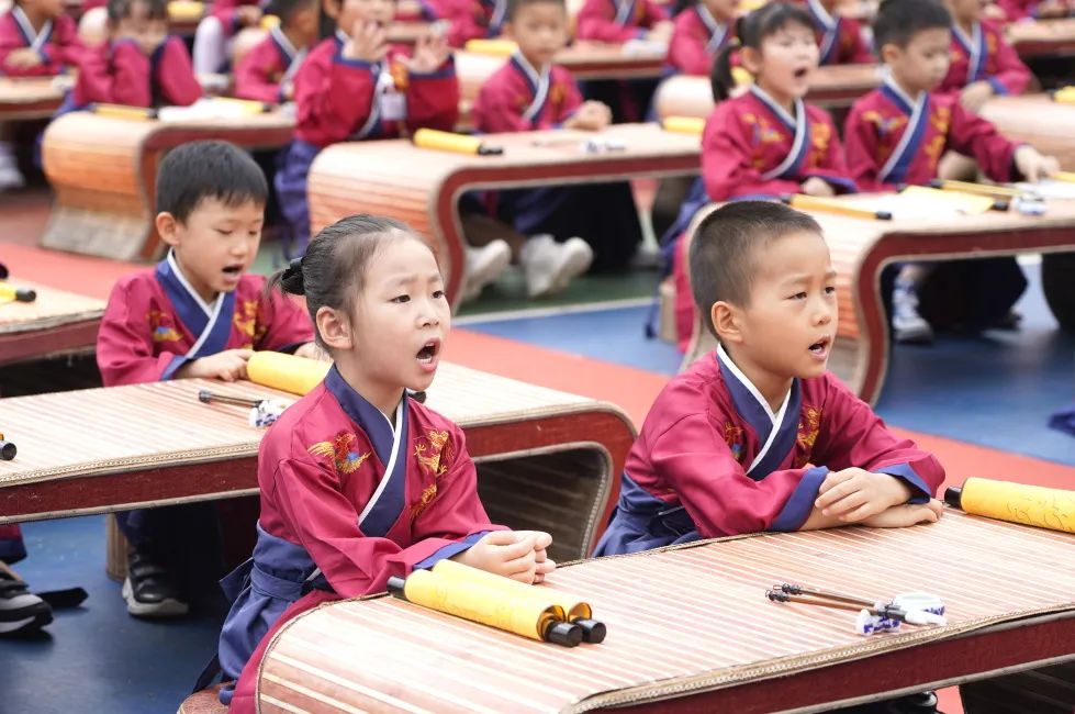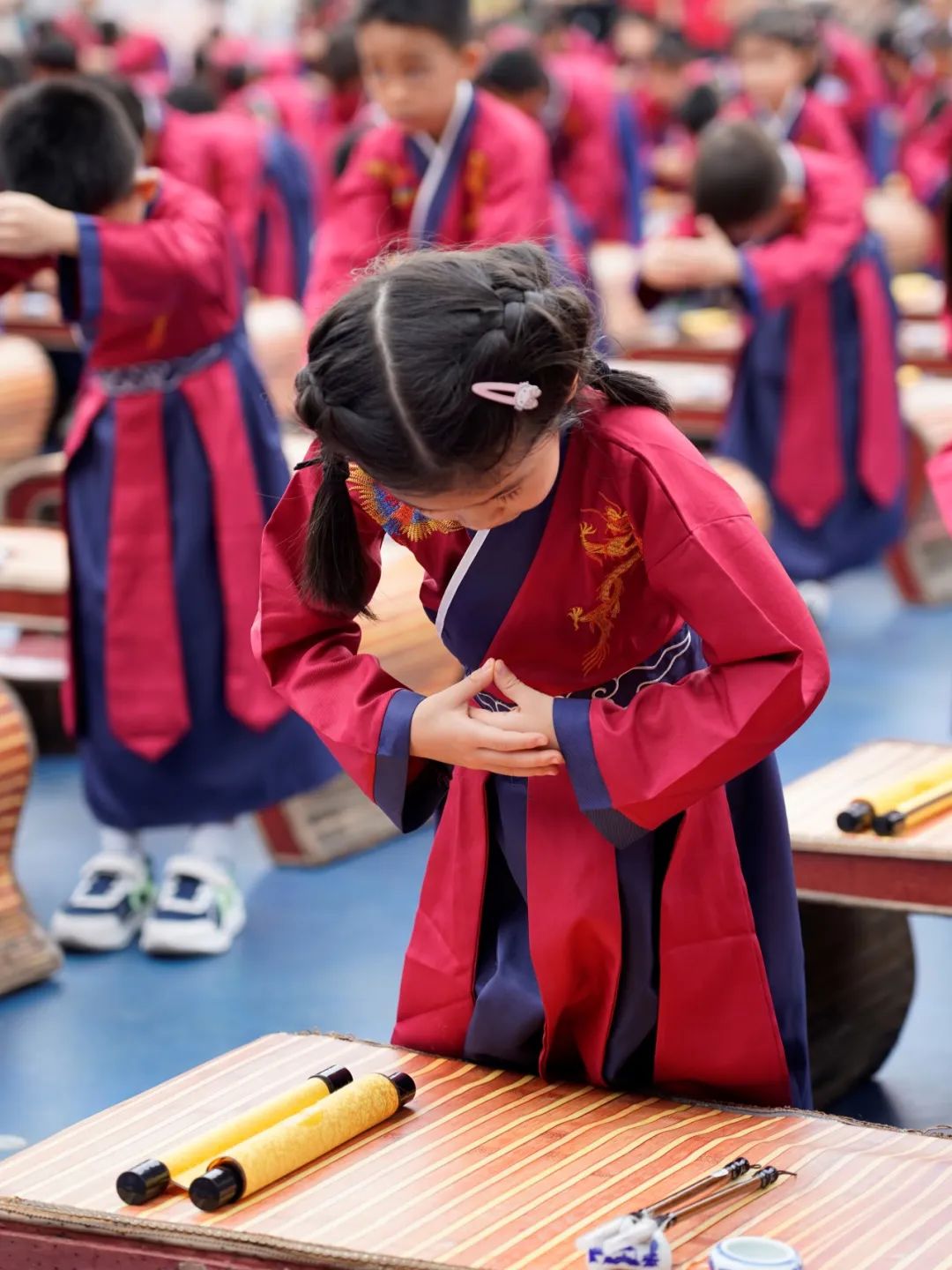 一年级年级组长聂芹老师带领学生代表赵梓清和鼓手汪笑宇、成其麟击鼓鸣志,大声宣言。一击鼓,勤奋读书;再击鼓,锻炼身体;三击鼓,强国有我!每一声鼓声都寓意着崭新的希望,击鼓三通,打开孩子们的愉快求学路。