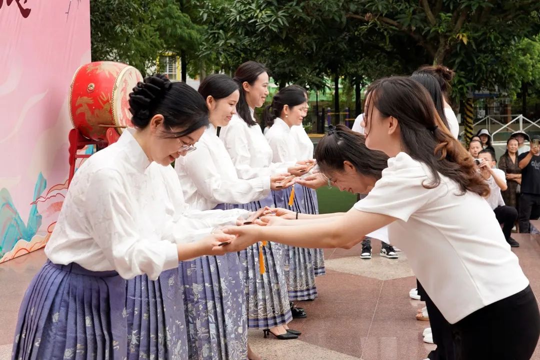 育我成长,如父似母。一年级的男生左手放于右手前,女生右手放于左手前,面向师长,弯腰行三拜之礼,表达最诚挚的敬意!