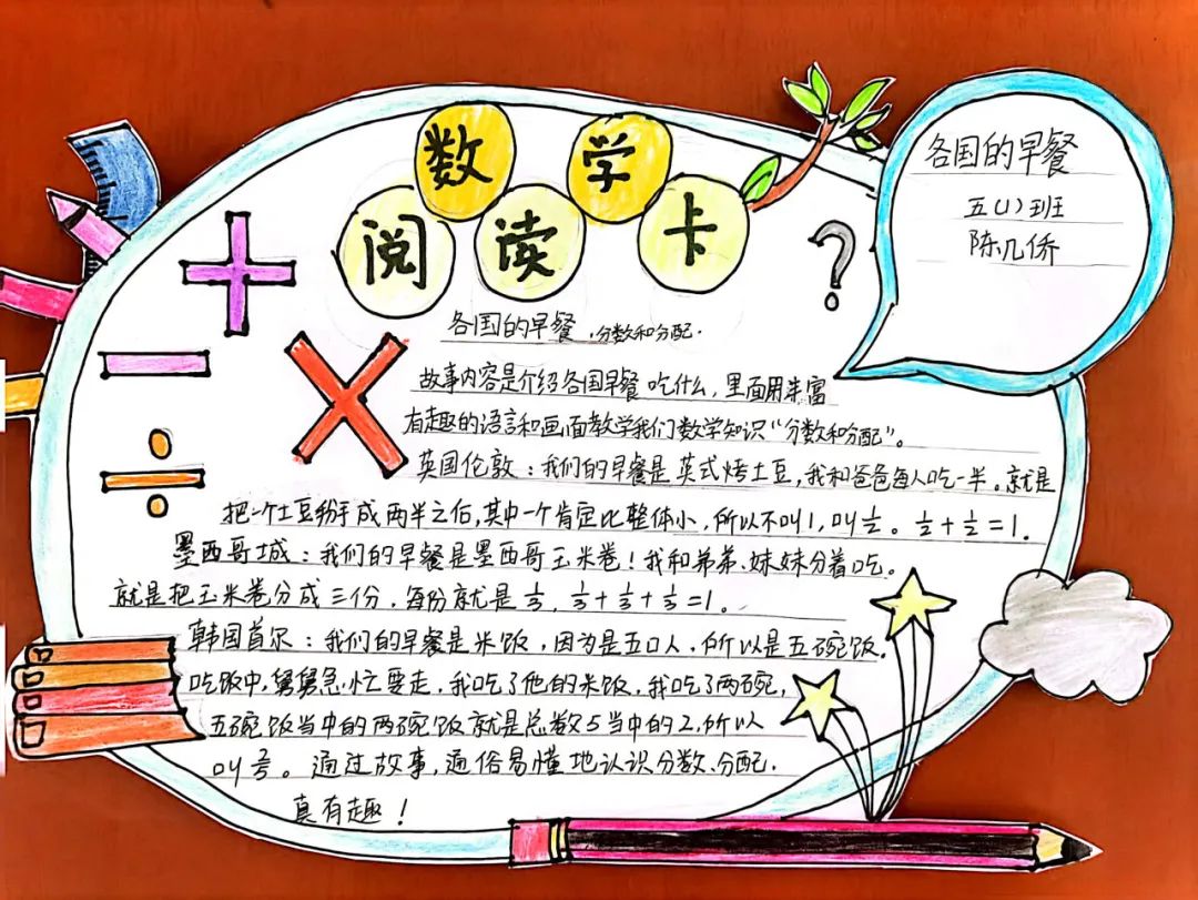 “最是书香能致远,腹有诗书气自华”,这是语文阅读的魅力。而数学阅读可以帮助我们获取数学知识、发展数学思维、五年级的学生制作的数学阅读卡,图文并茂、精致漂亮,凸显了他们阅读时的投入和情感,展现了他们的个性阅读。
