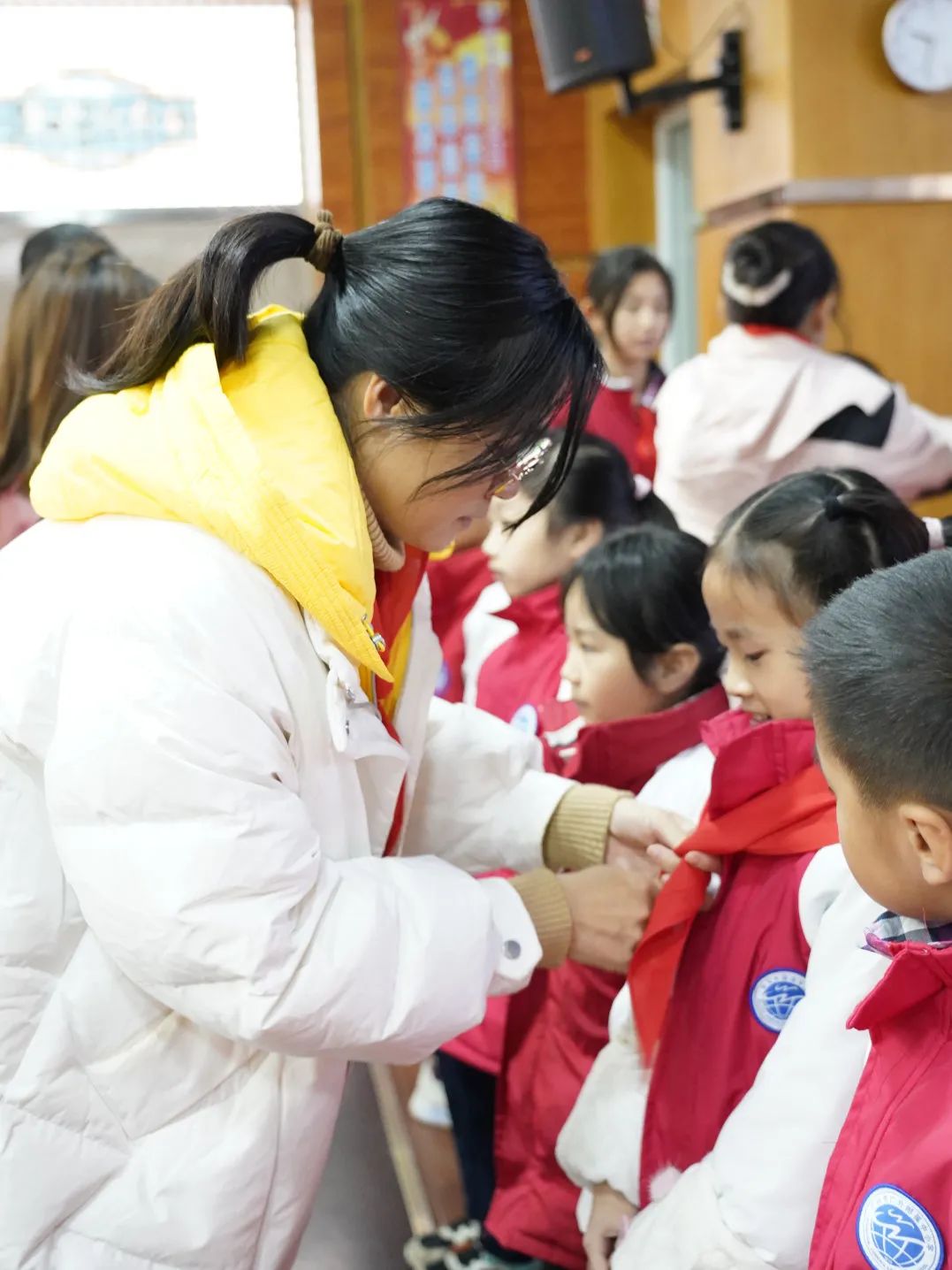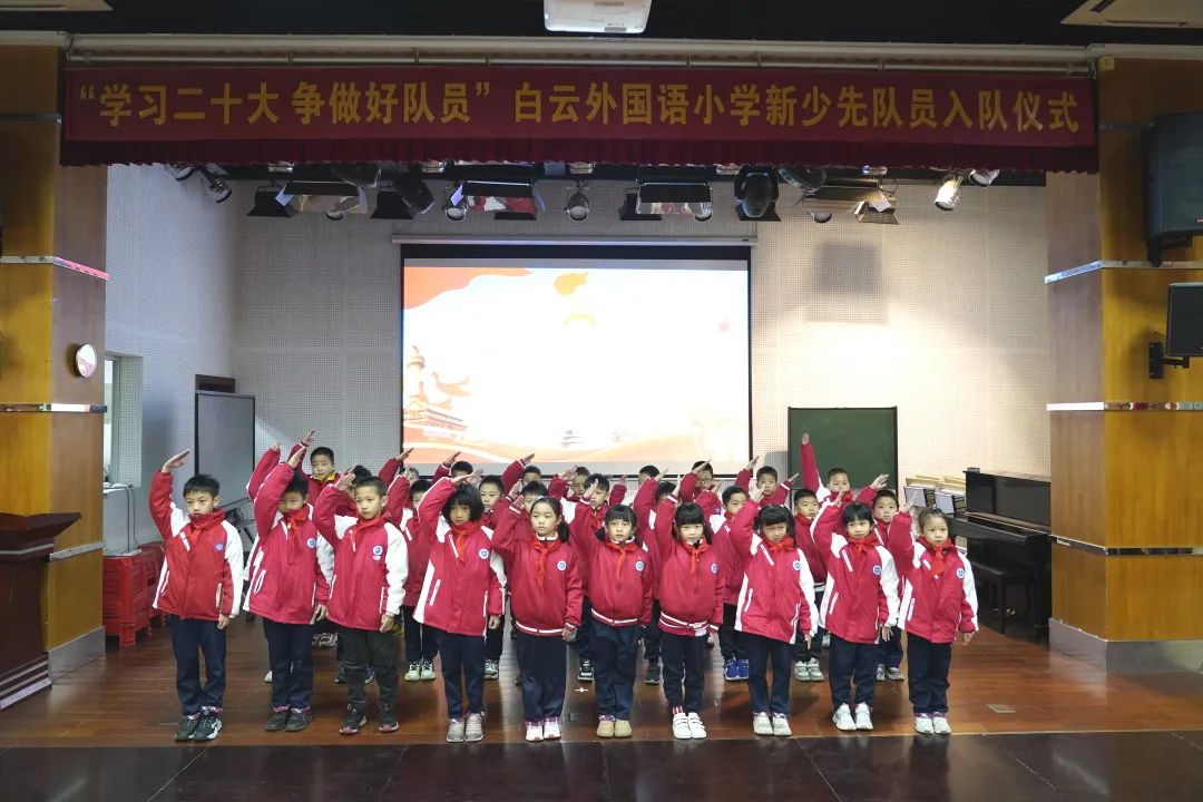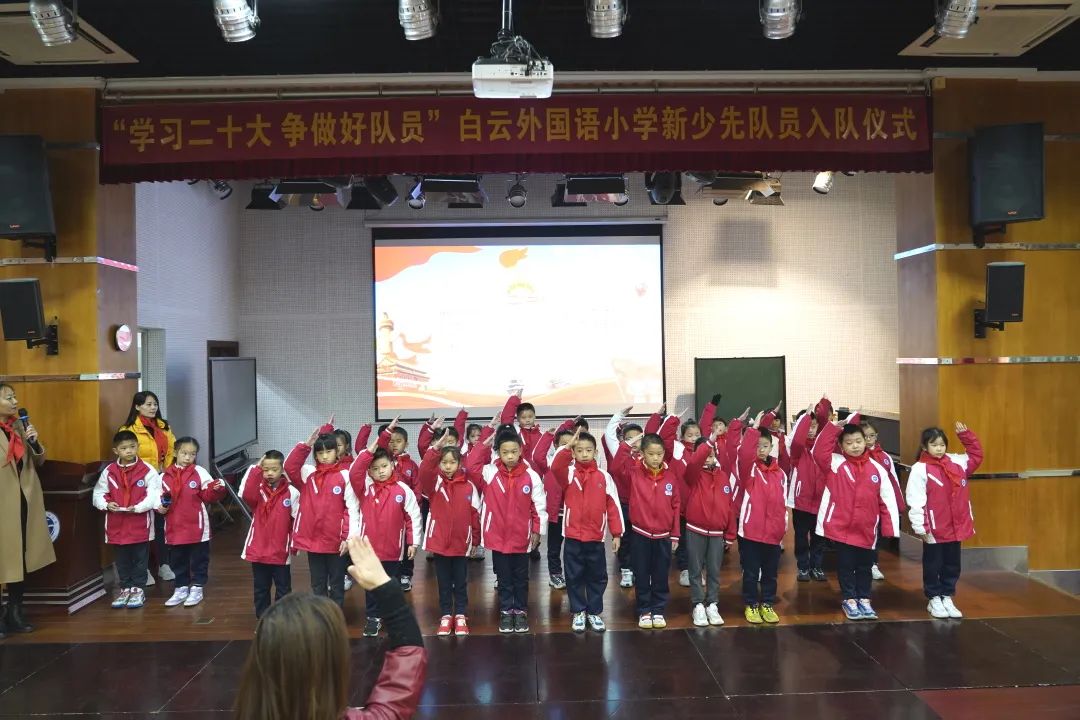 为深入贯彻落实习近平总书记关于少年儿童和少先队工作的重要指示精神,树立和增强少先队员的光荣感,12月20日白云外国语小学在学校礼堂举行了第二批少先队员的入队仪式,在少先队辅导员的带领下,在队旗的见证下,他们完成了人生中一次意义重大的、激动人心的仪式,正式成为了光荣的少先队队员。