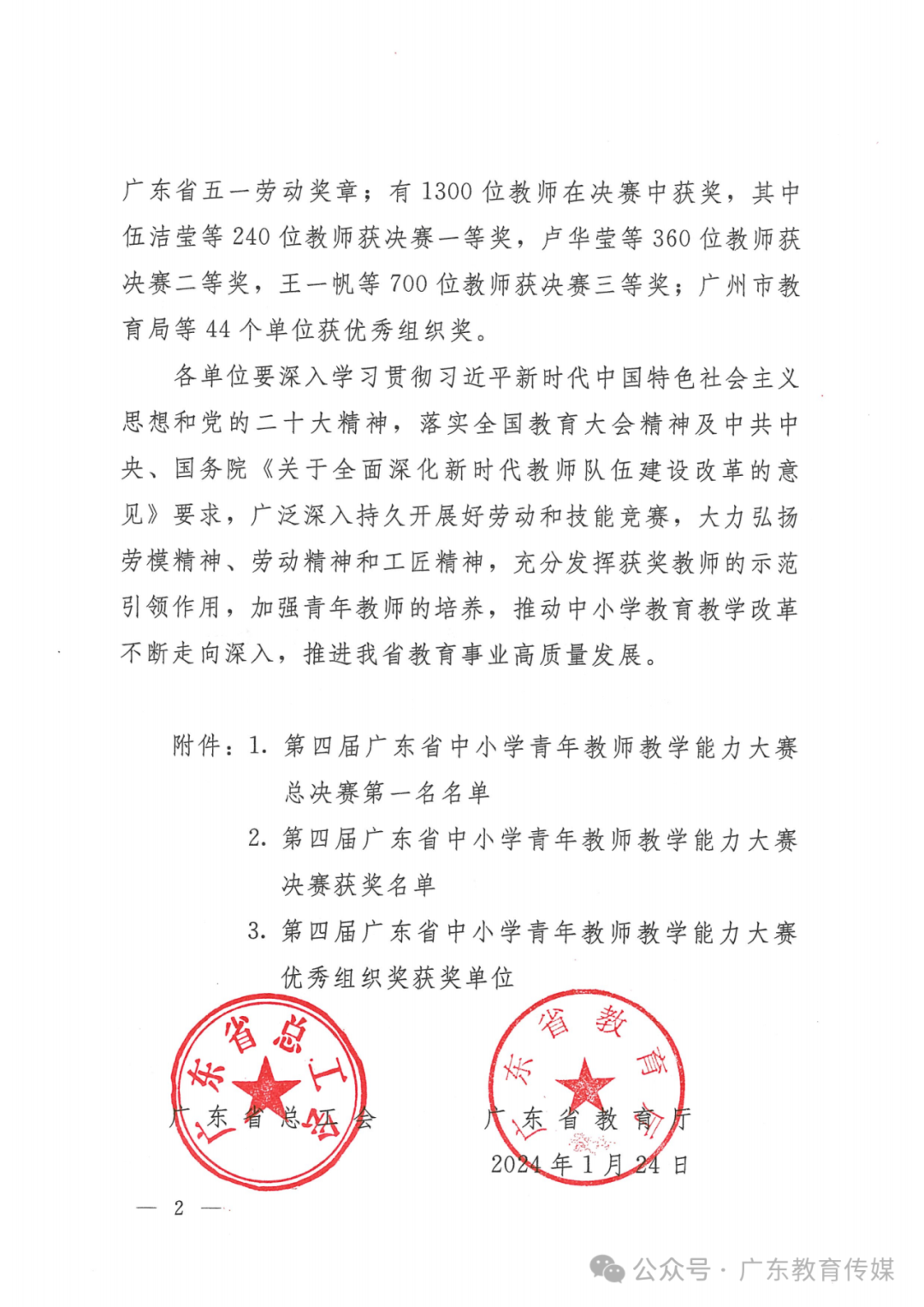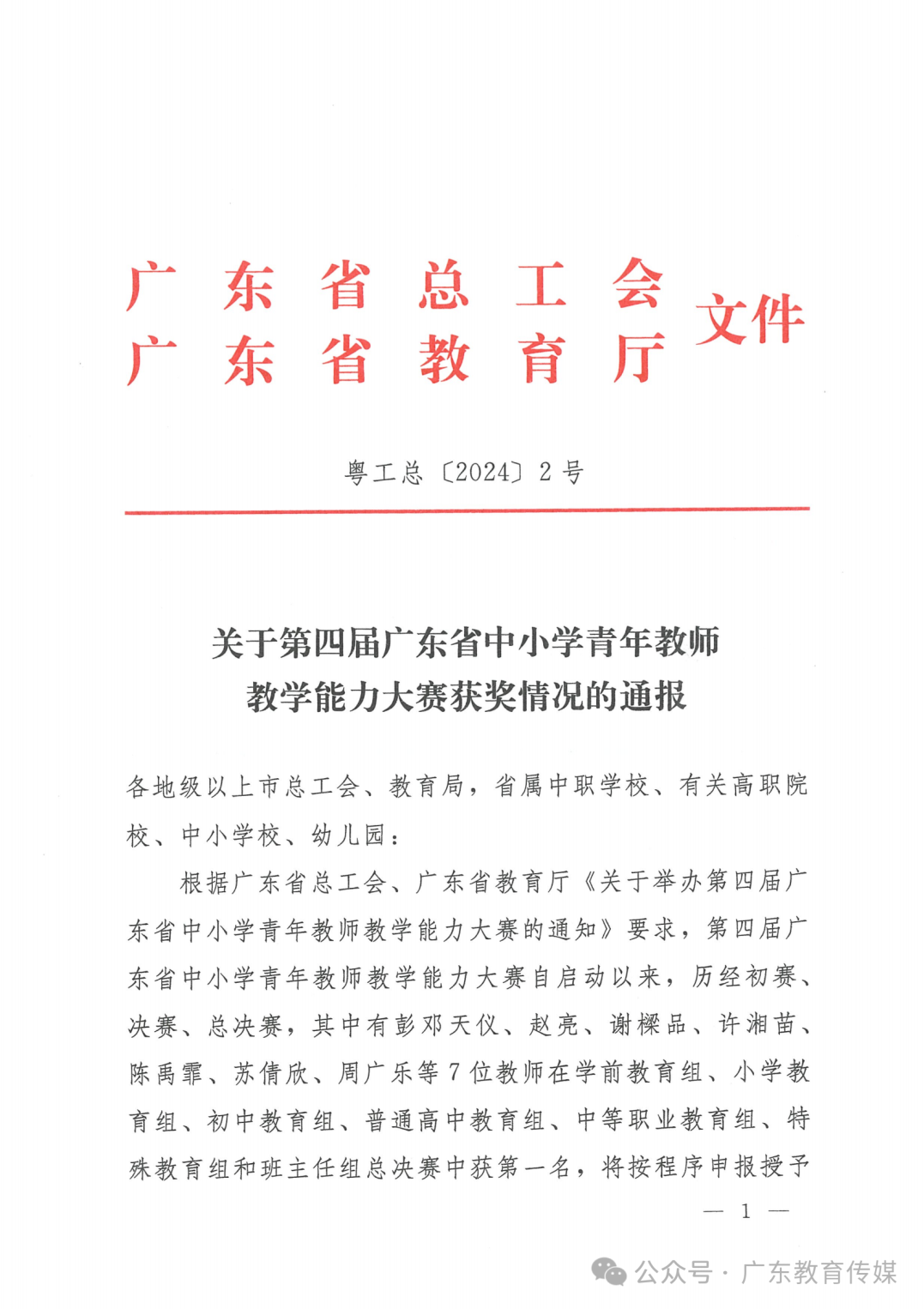 近日,广东省总工会、广东省教育厅发布《关于第四届广东省中小学青年教师教学能力大赛获奖情况的通报》。