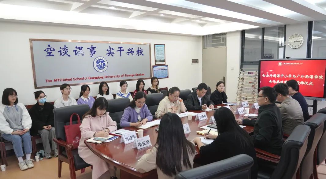 为深化高等教育与基础教育联合育人,加快建设高质量教育体系,培养高素质教师队伍。2024年3月15日下午,白云外国语中小学与广东外语外贸大学西方语言文化学院在学校第一会议室签署友好合作共建协议。参加会议的有:广东外语外贸大学西方语言文化学院院长杨晓敏、副院长陈星、党委副书记魏少娟、辅导员冯迪南、学院团委实践部负责人李睿及8位西语学院教员;白云外国语中小学党支部书记兼校长方建军、党支部副书记朱传兵、教师发展中心主任杨波、小学英语科组长喻安婷等。会议由我校校办陈丽丽副主任主持。