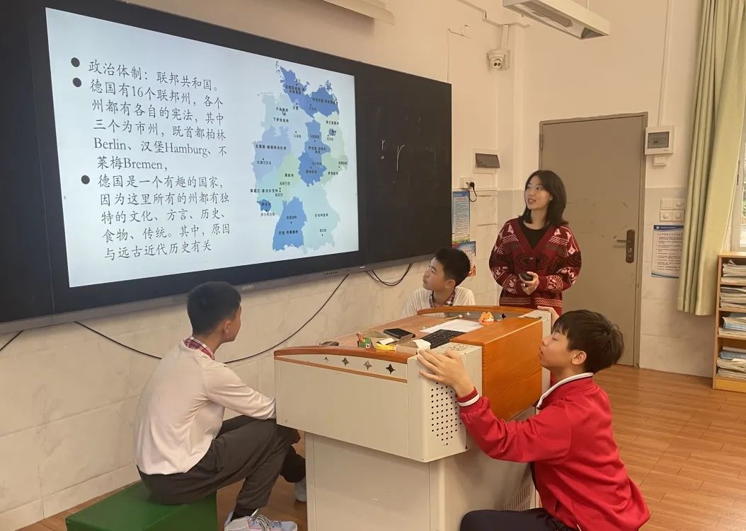德语教员卢酉玲代表广外西语学院教员进行发言。她分享了上学期在我校中学教授德语第二课堂的实践感悟,感谢中学老师在开展教学活动中给予的帮助。在课堂上,她完成了从“学生”到“老师”身份的转换,带领孩子走进德语的世界,帮助孩子成功迈出德语学习的第一步,同时,也在孩子的配合下,学会了运用教学设备,调节课堂气氛,把控课堂节奏等,在备课与教学的过程中,丰富了自己的知识储备。