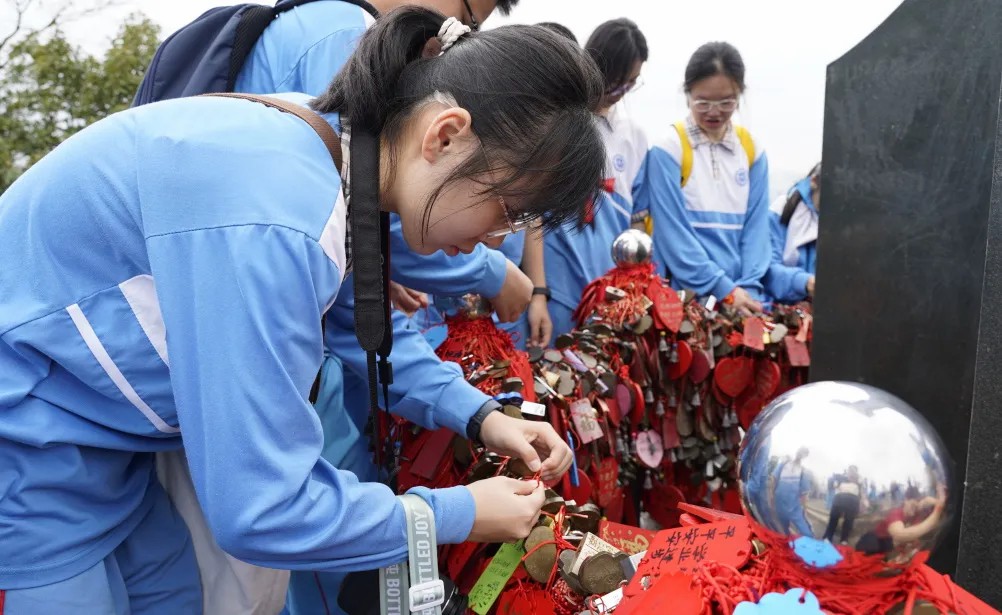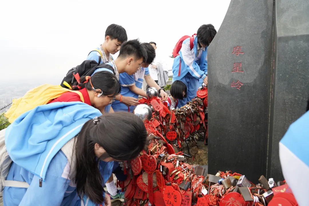 历经了两个多小时的爬坡与休整,大部队成功登顶摩星岭。同学们拿出自己精心准备好的心愿牌,有序地挂在许愿台上,充满了仪式感。