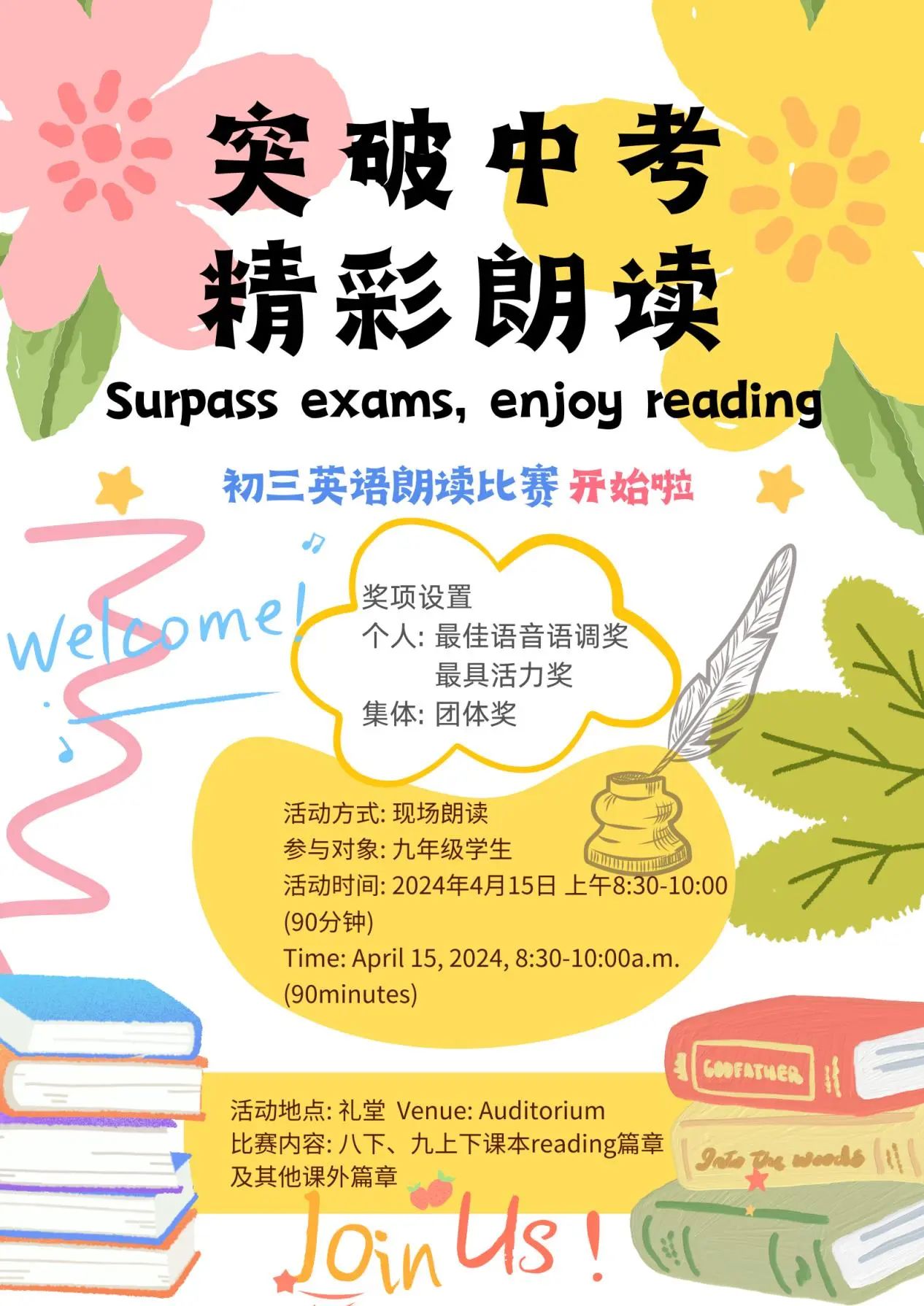 2024年4月15日上午,初三年级英语组举办的“Surpass exams, Enjoy reading”英语朗读比赛在学校礼堂隆重举行。此次活动旨在促进九年级学生英语的口语表达,提高其朗读能力及语音语调能力,同时为即将到来的中考英语听说考试预热。