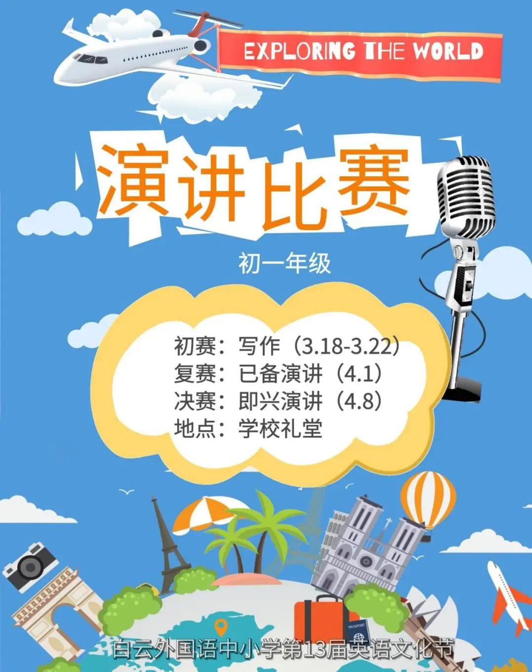 2024年4月16日下午,白云外国语中学初一年级演讲比赛拉开帷幕。作为第13届白云外国语中学英语文化节的一部分,选手们在“探索世界(Exploring the World)”的主题下各展风采,展示世界文化的方方面面,为观众们带来了一场视听盛宴。
