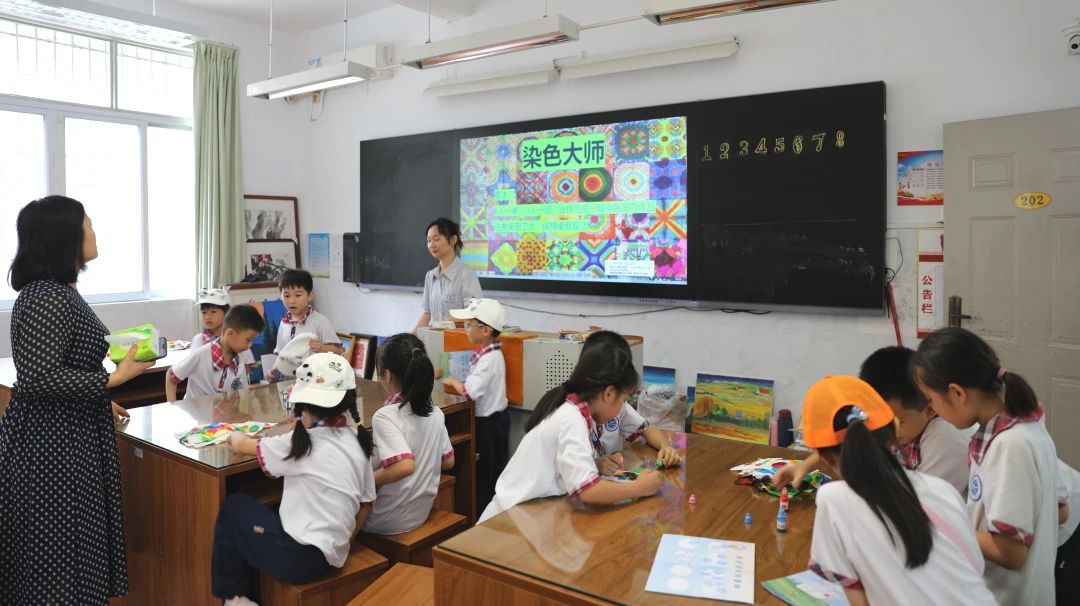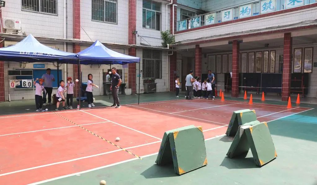 综合技能区:除了学科类的闯关,自然少不了美育和体育,同样精彩纷呈。“染色大师”:每位孩子通过自己调颜色,制作出一幅幅扎染作品,非遗的精神得以延续;“正确摆放指南针”和“磁悬浮小火车”孩子们通过平时学习到的科学知识,运用到实际中很好地理解了知识点,并从中产生无限乐趣。最后的“小小投弹手”、“坐位体前屈”和“拍球绕障碍投球进圈游戏”很好地考核了孩子们的投篮技术、柔韧性和体能,孩子们为了得到更多的奖章,可以在这些项目多次尝试,不断挑战自我,奋勇前行。