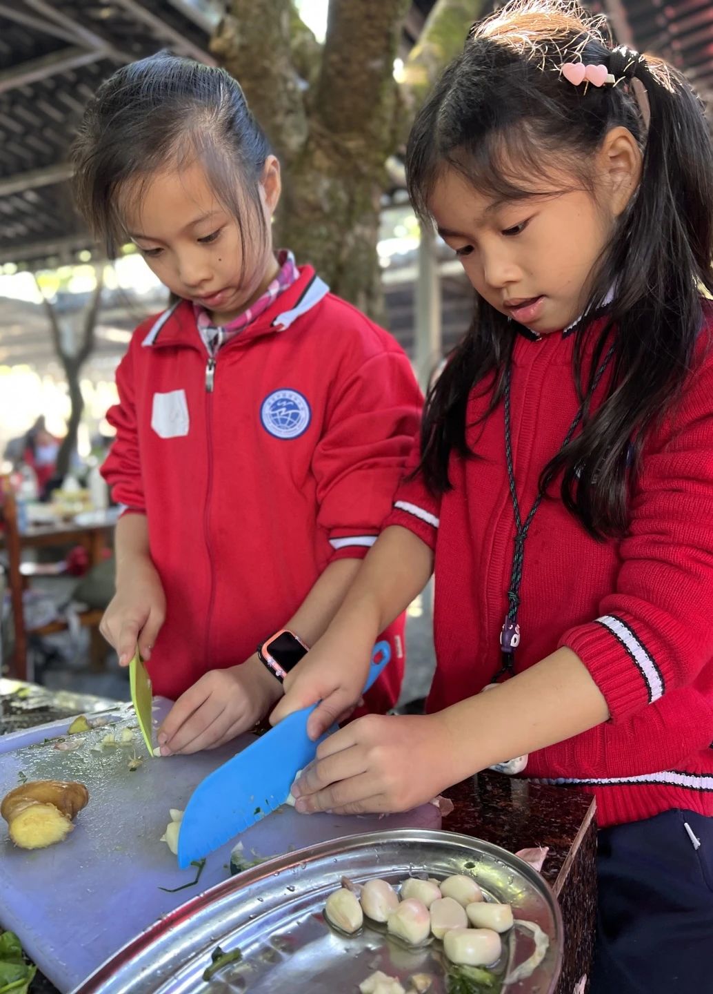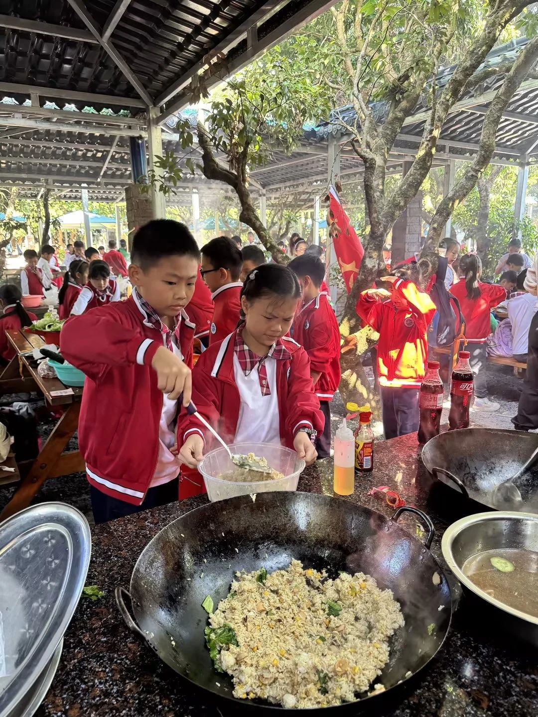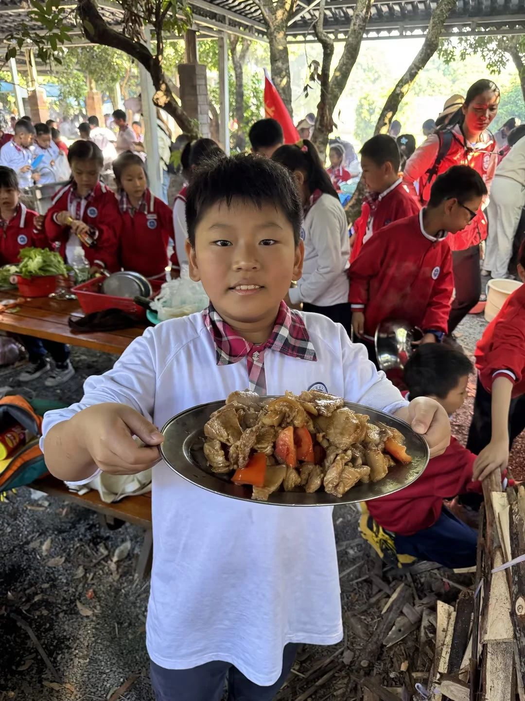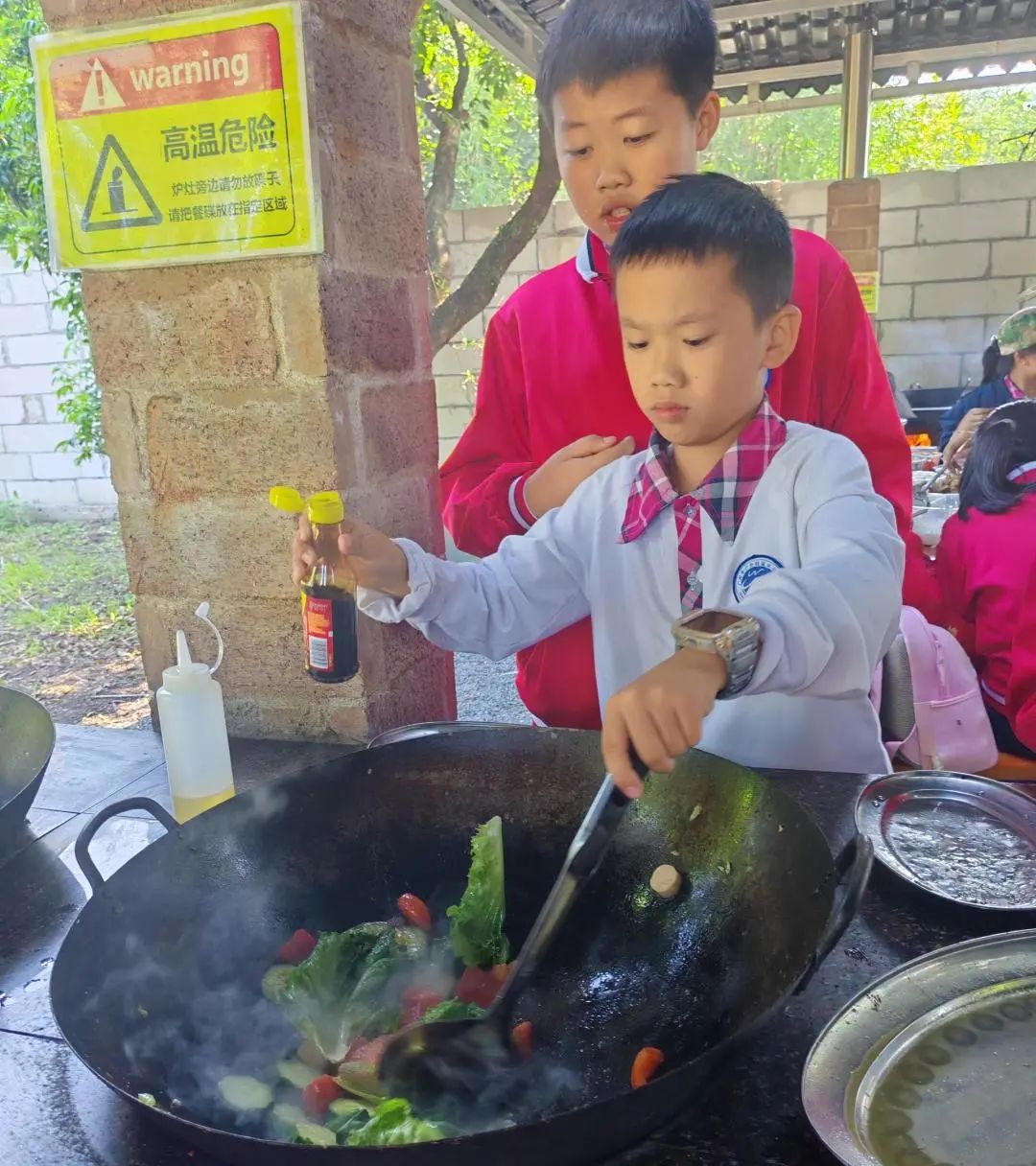 中午的活动是孩子们特别期待的——荔枝林野炊。每班提前分好小组,由学生自己烹饪,食材丰富,有斩小件的走地鸡、鱼腐、土猪肉、鸡中翼、土鸡蛋、玉米粒、火腿肠、西红柿、青瓜、营地时蔬、紫菜等,这些食材在孩子们团结协作下都变成了美味可口的菜肴。自己做的午餐吃起来格外香,孩子们吃得津津有味。吃饭的“我们”最乖最听话,一张张灿烂的笑脸,纯真的笑容,如春天的阳光,温暖明媚,让人心情舒畅。