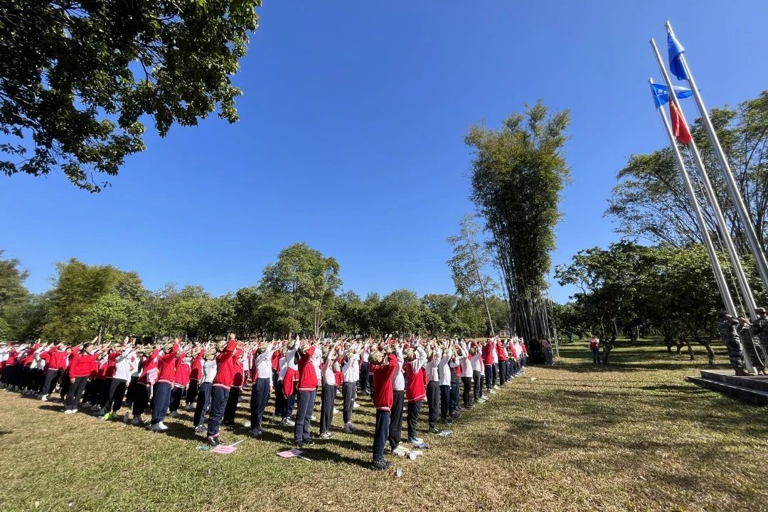 在导游和老师的带领下,同学们终于进入了期盼已久的乐园,首先,全体师生在教官的带领下进行了庄严的升旗仪式。紧接着,学生发展中心郑文静主任和聂芹副主任分别讲话并宣布此次国防教育正式开营。