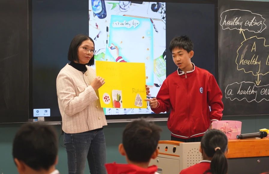 英语张春燕老师带领六年级(1)班的同学们开展了一堂主题为“A Healthy Life”的别开生面的英语复习拓展课,通过实际情境的创设,激发学生的思考和参与,有效提升了学生的综合语言运用能力。本节课围绕乡村和城市生活,通过观看视频、讨论、阅读绘本和文章,复习了重点词汇,并引导学生探讨健康生活的定义,旨在提升学生的批判性思维和健康生活意识。学生们通过小组合作制作健康生活宣传海报,将课堂所学转化为实际行动,展现了英语学科的实际应用能力。课程设计还融合了古诗词、科学、AI技术、美术等跨学科知识,极大地拓展了课堂的广度和深度,增强了教学的趣味性和实用性。这节课不仅增强了学生的语言运用能力,训练了学生的批判性思维,还提升了他们对健康生活方式的认知,让学生在轻松愉快的氛围中学习英语,关注生活。