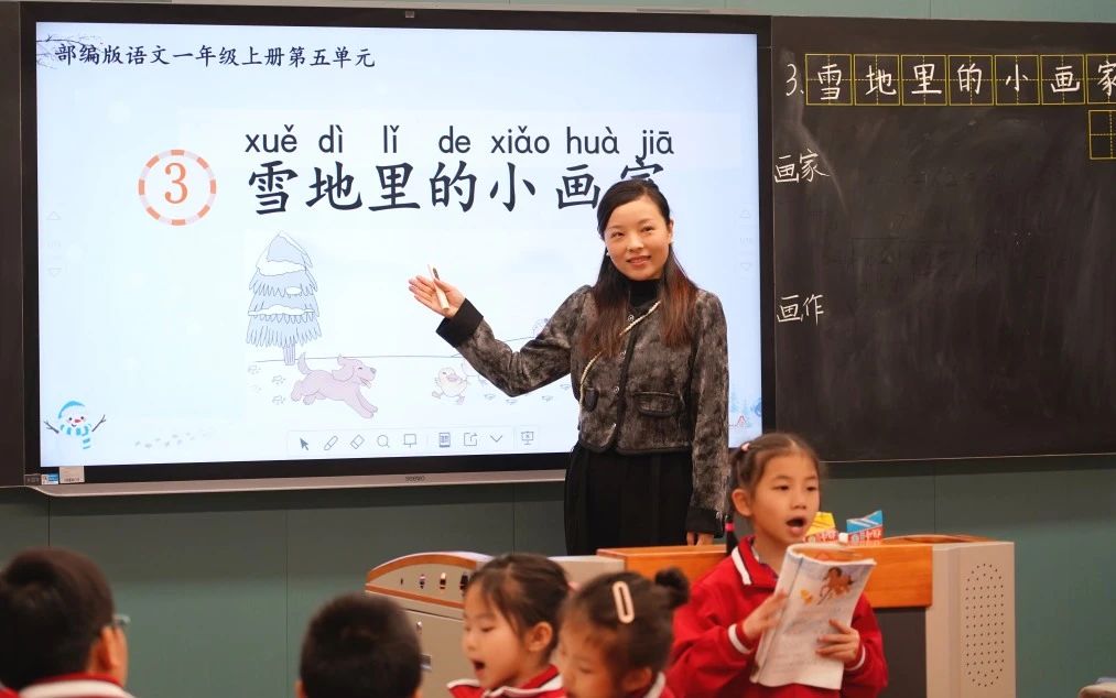 陈雅男老师执教一年级语文课《雪地里的小画家》。本课是小学语文部编版一年级上册第五单元第三篇课文,是一首富有儿童情趣、蕴含科普知识的儿歌,描绘了一群“小画家”在雪地里作画的场景,语言浅显易懂,读起来朗朗上口,生动有趣。陈老师的课堂营造了浓浓的冬日雪景氛围,让孩子们大胆想象在雪地里狂欢,增加了学习的趣味性;在雪地里歌唱,让学生通过音乐感受冬天的魅力和动物的可爱;在雪地里绘画,让学生将文字转化为图像,锻炼了他们的想象力和创造力,加深了对课文内容的理解和记忆;探索小青蛙冬眠的奥秘,提升科学思维。整堂课巧妙地将语文与绘画、音乐、科学知识等融合,激发学生的学习兴趣,培养学生的观察力、想象力、语言表达能力和创造力。