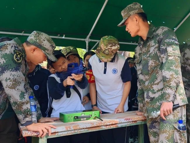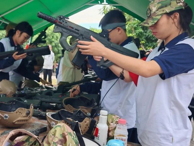 轻武器射击:少年们凝神聚焦,专注而严肃,俨然一名小小战士。轻武器射击体验,附中学子们手上拿起的是枪,心中生出的是责任感,是爱国心。
