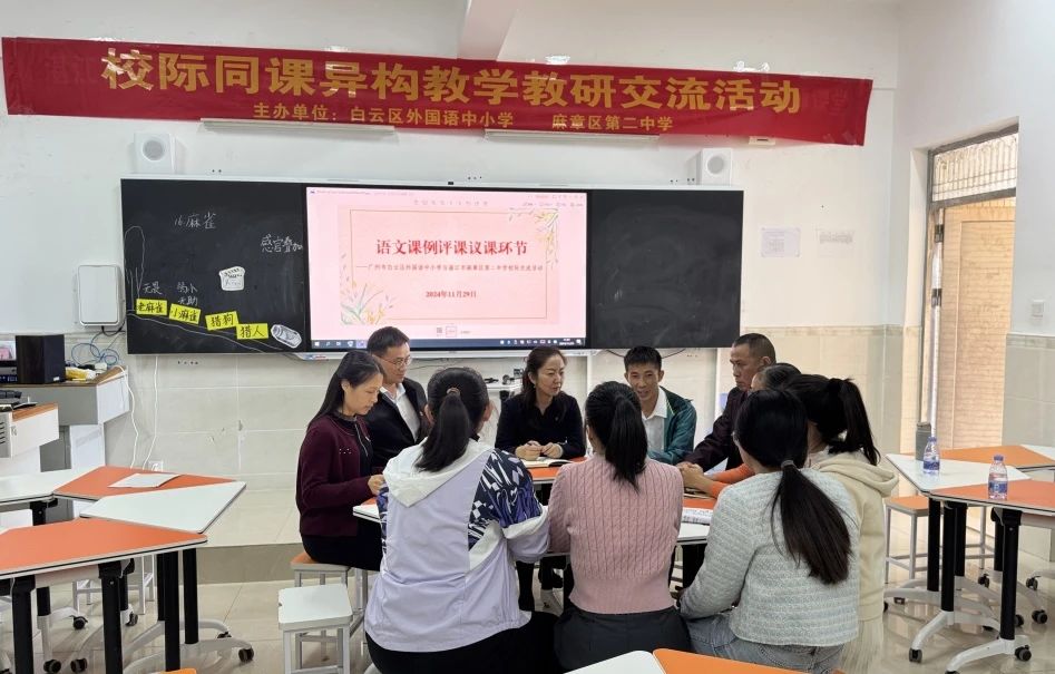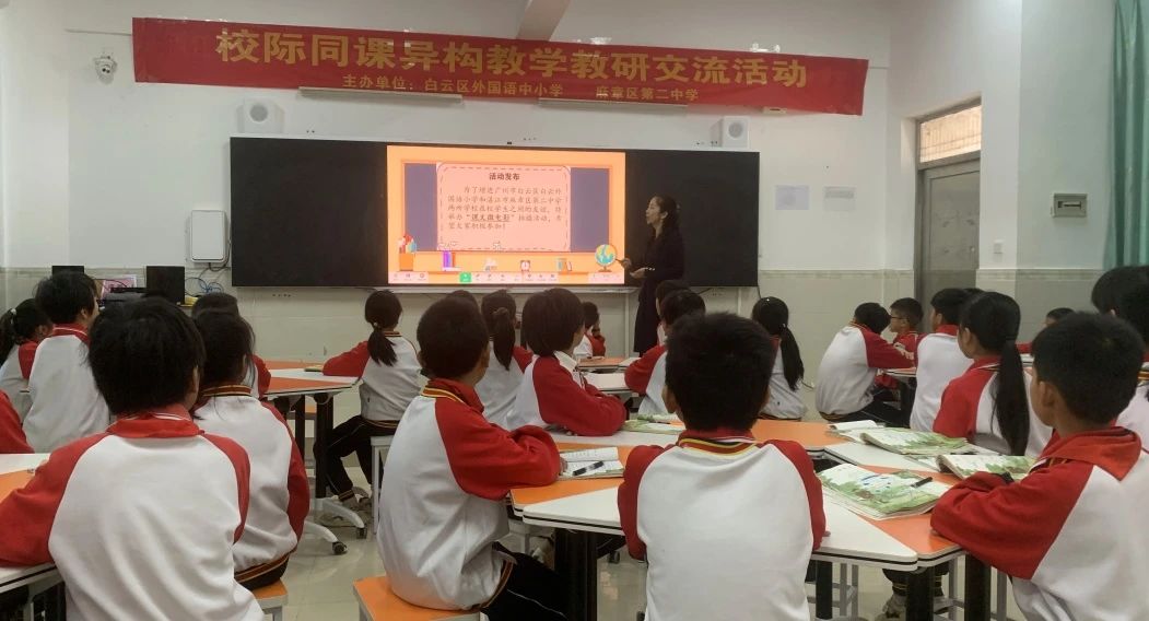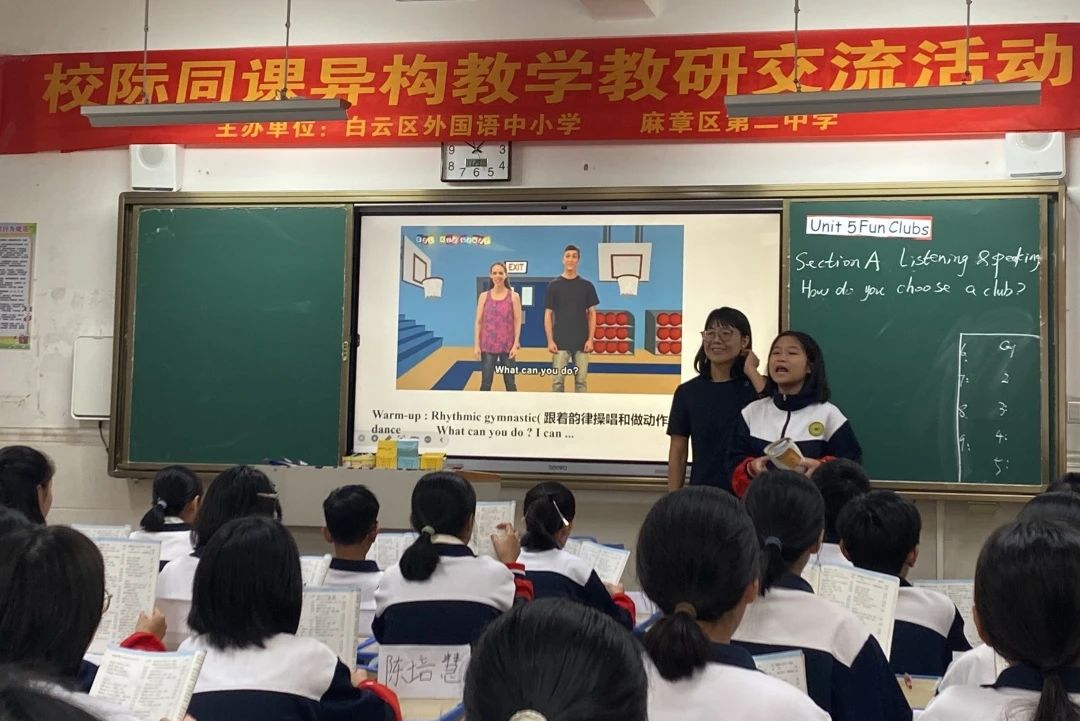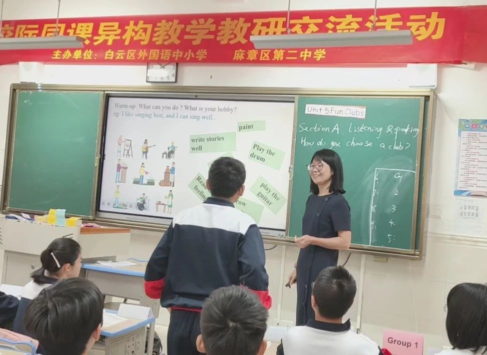 七年级英语课则是由我校中学英语教师何春玲和麻章区第二中学的张玉熔老师进行2024人教版七年级上册unit5 《How do you choose a school club》听说课的同课异构课堂展示活动。两位老师各有侧重,张老师的课堂给了学生充分练习听力的时间和技巧指导,并提炼影响选择社团的四个要素。老师还提前让学生设计九个社团的英文海报,课上模拟招新角色扮演,锻炼了学生用英语做事的能力。