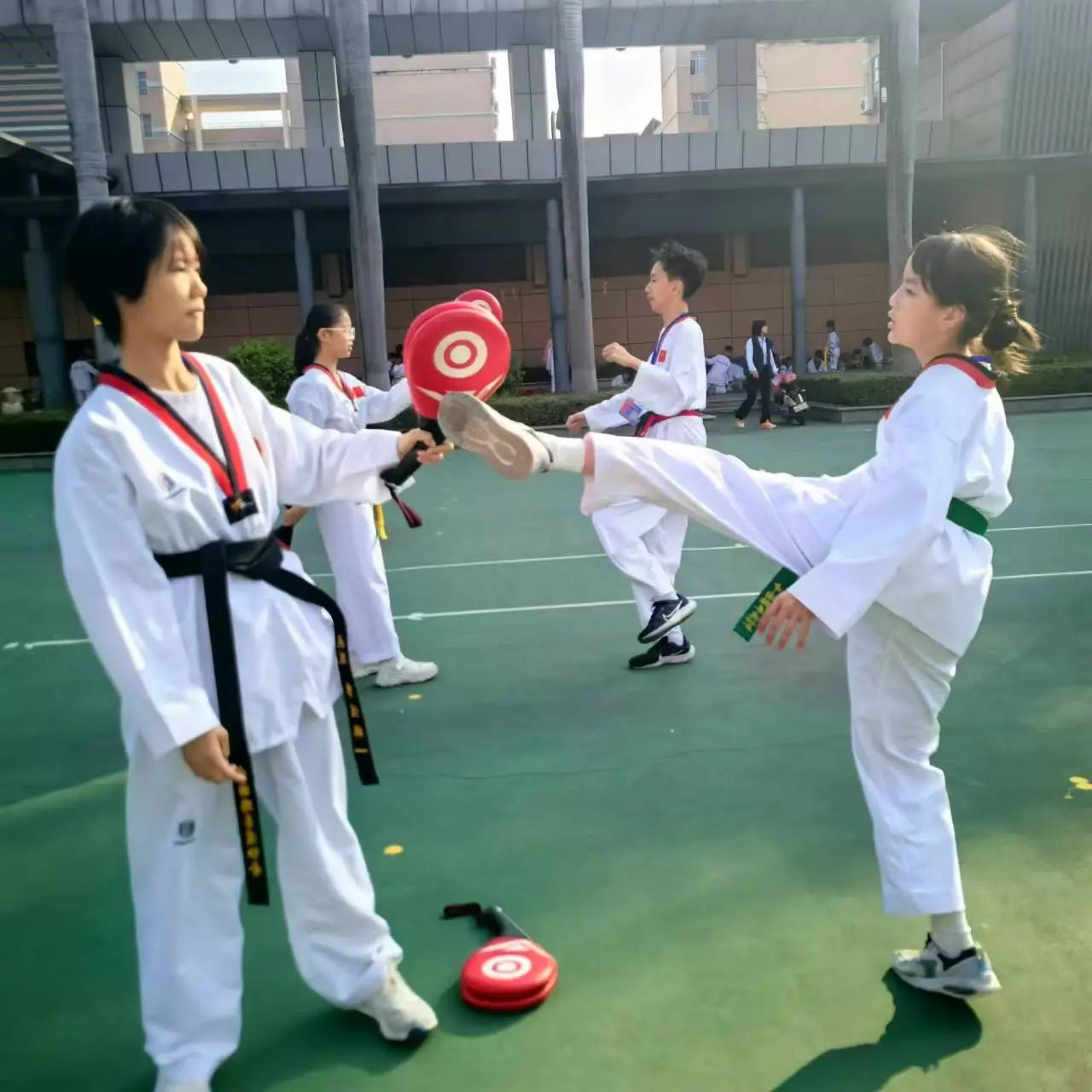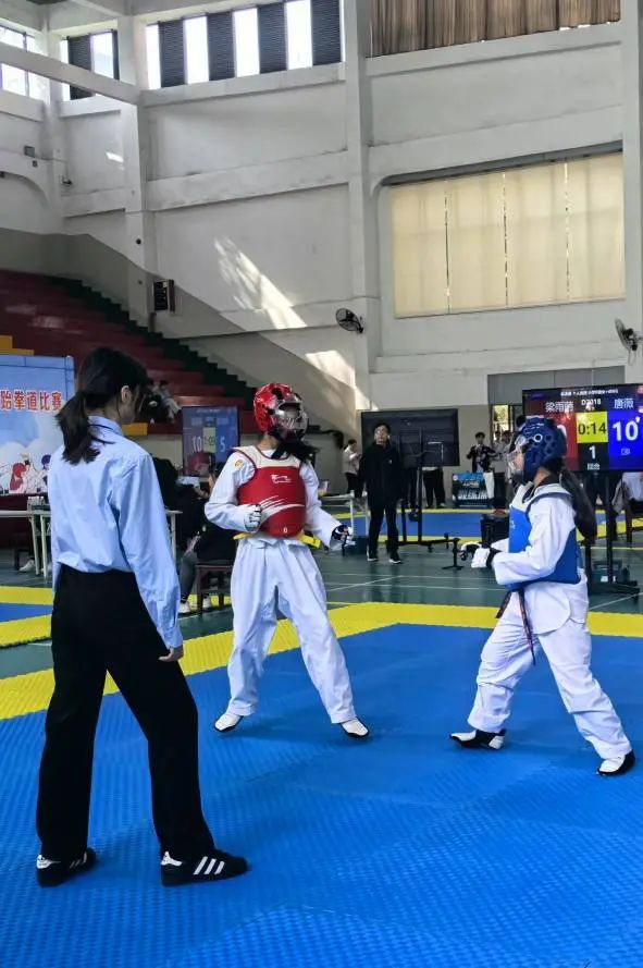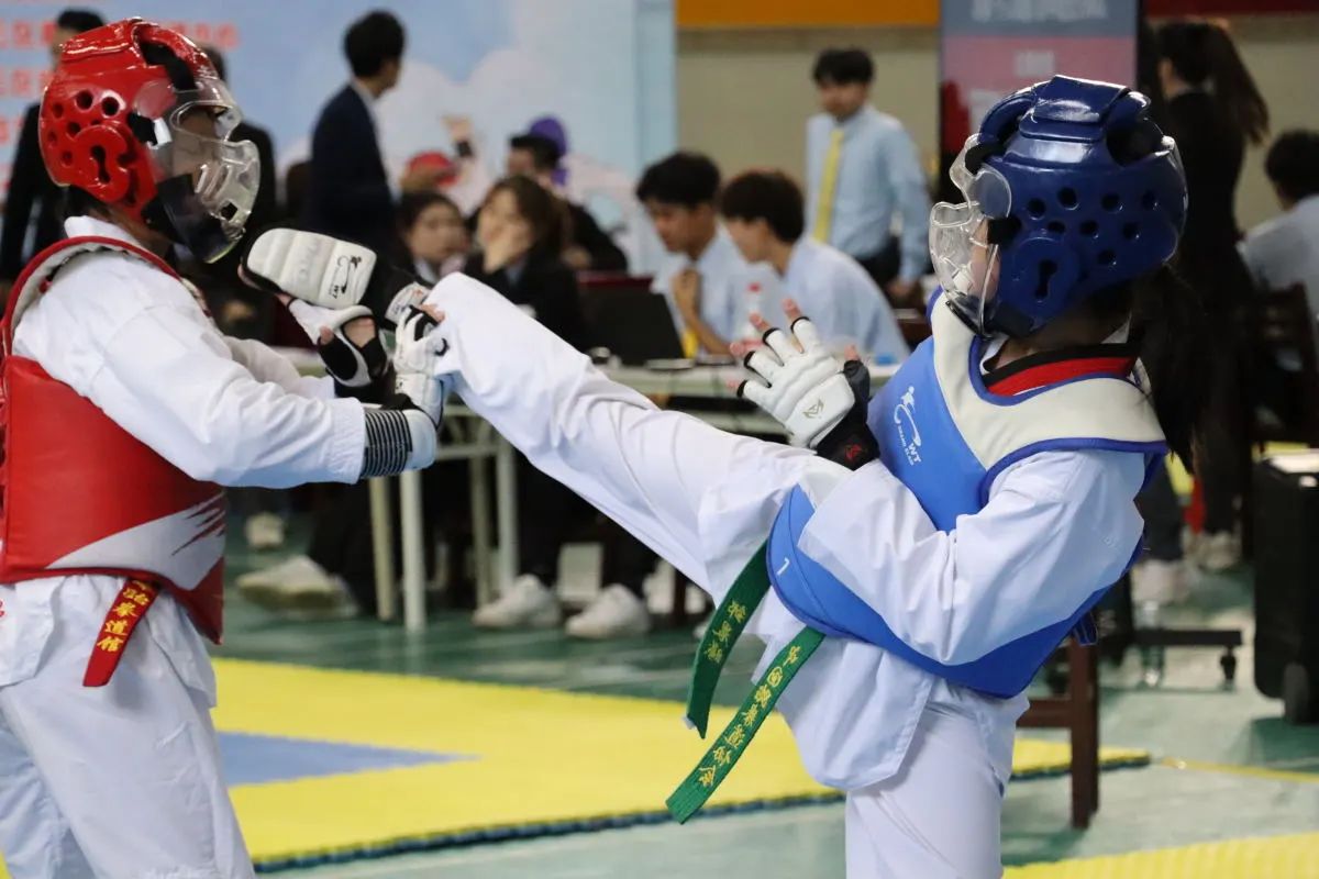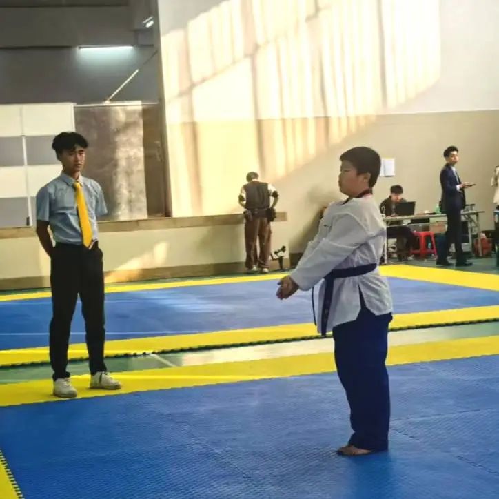 跆拳道比赛不仅是选手技艺的较量和切磋,还有战术、打法的PK,更是心态、韧劲、斗志的挑战!所以要想参加比赛就得有过硬的技战术、良好的心态、顽强的毅力。唐晓霞老师带动跆拳道队的孩子们持续坚持训练,并在赛前进行集训,针对学生前腿技术、单击、组合技术,针对不同对手的实战演练等进行强化练习,让学生逐步进入比赛状态。跆拳道队员们刻苦训练,认真练习每个腿法,进行模拟实战,练习同水平,不同水平、身高选手的打法和对策,以便应对比赛中的对手。针对初中高级品势比赛—高丽,根据比赛规则和打分,细抠每个动作,纠正动作发力、发声、节奏,争取在比赛中有精彩的表现。