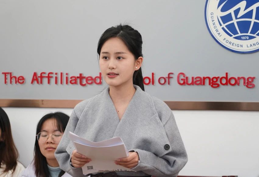 广外南国商学院教育学院的袁丽梦同学和英文学院的陈昭颖同学作为实习生代表进行发言。在接下来的实习中,她们将会虚心向指导老师学习,汲取教学经验,提升教学能力,将所学知识运用于实践,点亮孩子们的学习之路;以热情、严谨、努力的态度,迎接挑战、珍惜机会、关爱学生,深入课堂提升专业素养,用爱心、耐心和智慧去启发学生,做他们成长路上的良师益友。