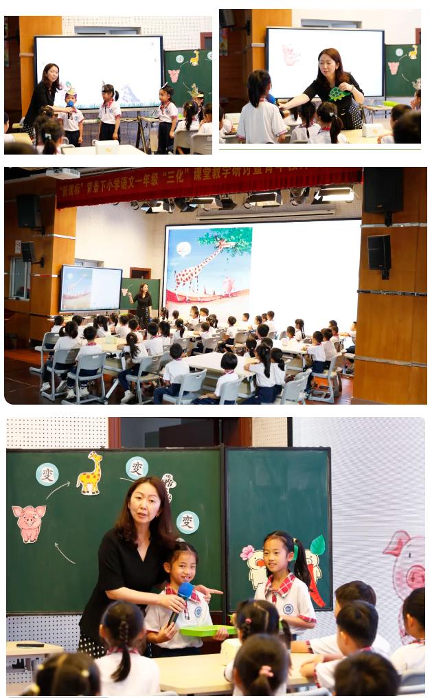 我校唐龄老师的图画书阅读指导课例《小猪变形记》则展现了本校在“三化”课堂中的创新探索。唐老师以“小猪的心情”为线索,通过“猜猜小猪又会变成谁”“我替小猪来变装”“变形小猪我来演”等沉浸式环节,让学生在观察画面、模仿对话、创意表演中感受“做自己最快乐”的主题。她特别设计的“夸夸小猪”“夸夸我自己”等互动环节,将情感教育与语言表达有机融合,学生在一次次陪着小猪变形成各种动物的过程中体会到了“做自己最快乐”的道理,最后一个环节“星光发布会”,更是让课堂变成了孩子们展示自己优点特长的舞台。整节课气氛活跃,充分体现了“以儿童为中心”的教学理念,获现场教师点赞:“从‘教课文’到‘玩图画书’,唐老师的课堂让我们看到了低年级语文的无限可能。”