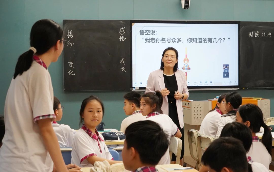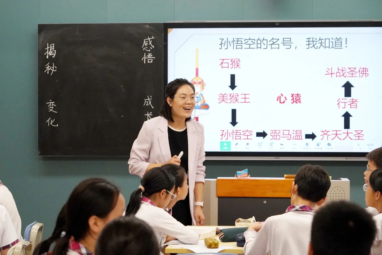 语文黄秋敏老师给学生带来一节《探秘“心猿”变化,感悟英雄成长》的西游记名著导读课,课堂上,黄老师用ai生成孙悟空形象激趣导入,从“心猿”的名称着手,让学生在原著中感受孙悟空不同时期的变化,体会英雄一路成长的奋斗历程。黄老师用诙谐有趣的教学语言,激发学生在课堂上积极参与,以此导读课,激发学生们在中学学习生涯中,深度阅读,虚心向上。