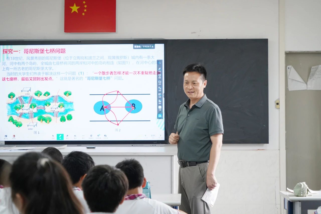 数学朱传兵老师引领同学们从日常生活中的实际问题出发,深入探究“哥尼斯堡七桥问题”、“排序问题”等经典案例,借此引入AI时代的算法思维。他以点带面,帮助孩子们体验“数学抽象”与“直观想象”的数学思想,领会“化归与转化”的数学方法。通过这一过程,学生得以亲身感受进入中学阶段后,如何“用数学的眼光观察世界、用数学的思维分析世界、用数学的语言表达世界”的独特学科魅力。