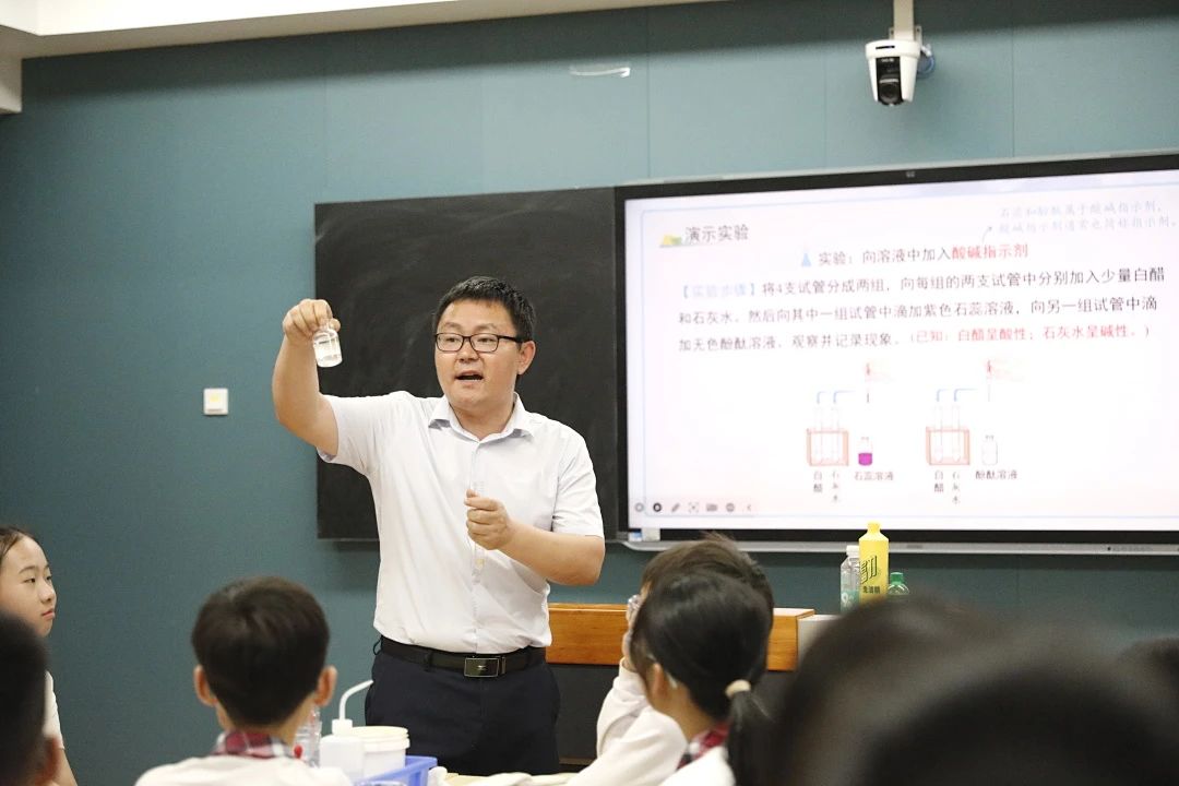 化学李红海老师的课堂从孩子们的生活经验出发,引导他们认识酸性和碱性物质,并教授如何利用酸碱指示剂进行酸碱的检验与鉴别。随后,他将自来水的净化工艺融入教学,带领孩子们对模拟环境中的自然水进行活性炭吸附实验。通过这一过程,孩子们不仅掌握了科学探究的方法,还深刻体会到动手实验的乐趣。