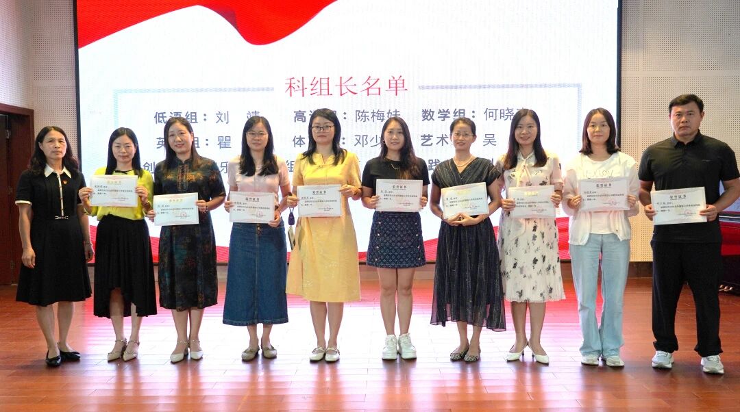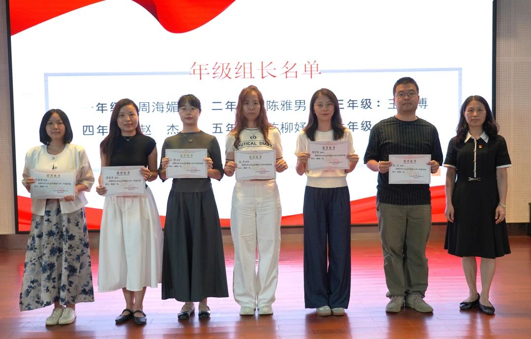 会议伊始,聘书颁发流程有序进行。教师发展中心张玉静副主任负责宣读“青蓝工程”师徒结对名单,小学学生发展中心聂芹副主任宣读新学年年级组长和科组长名单,由黄哲昙副校长为受聘老师颁发聘书。