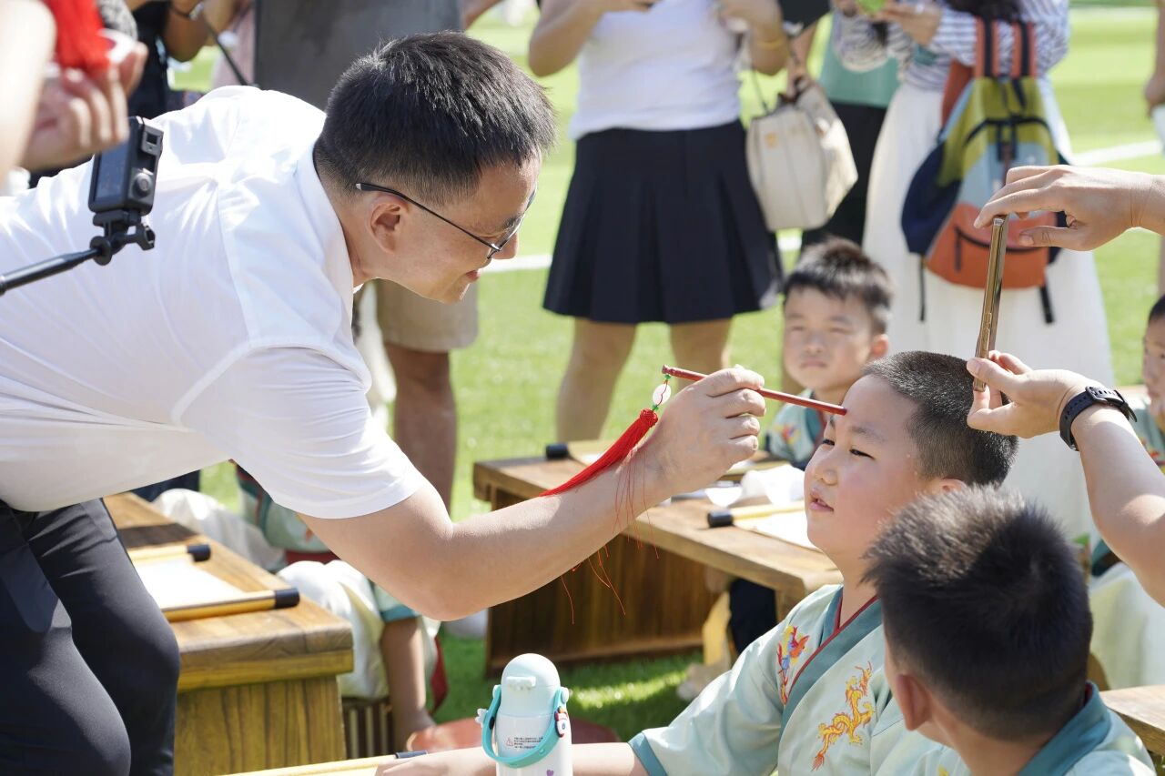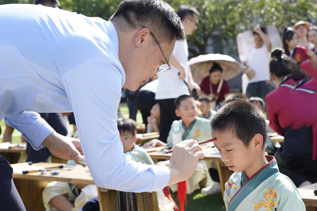 最受期待 “朱砂启智”环节到来时,学校领导与老师手持朱砂,在每一位新生的额头正中点上红痣。这一被称为“开天眼”的传统仪式,寓意着开启孩子的智慧,愿他们从此眼明心亮、发奋读书。孩子们睁着明亮的眼睛,认真感受这一神圣时刻,脸上洋溢着对知识的渴望。