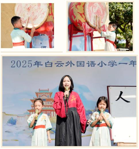 随后的 “击鼓鸣志” 环节将仪式推向高潮。一年级年级组长周海媚老师带领一(2)班凌所思、一(3)班何瑾瑜两位学生代表上台击鼓宣言。“勤奋读书,锻炼身体,强国有我”,清脆的鼓声与响亮的宣言交织在一起,展现了新生们奋发向上的志向与担当。
