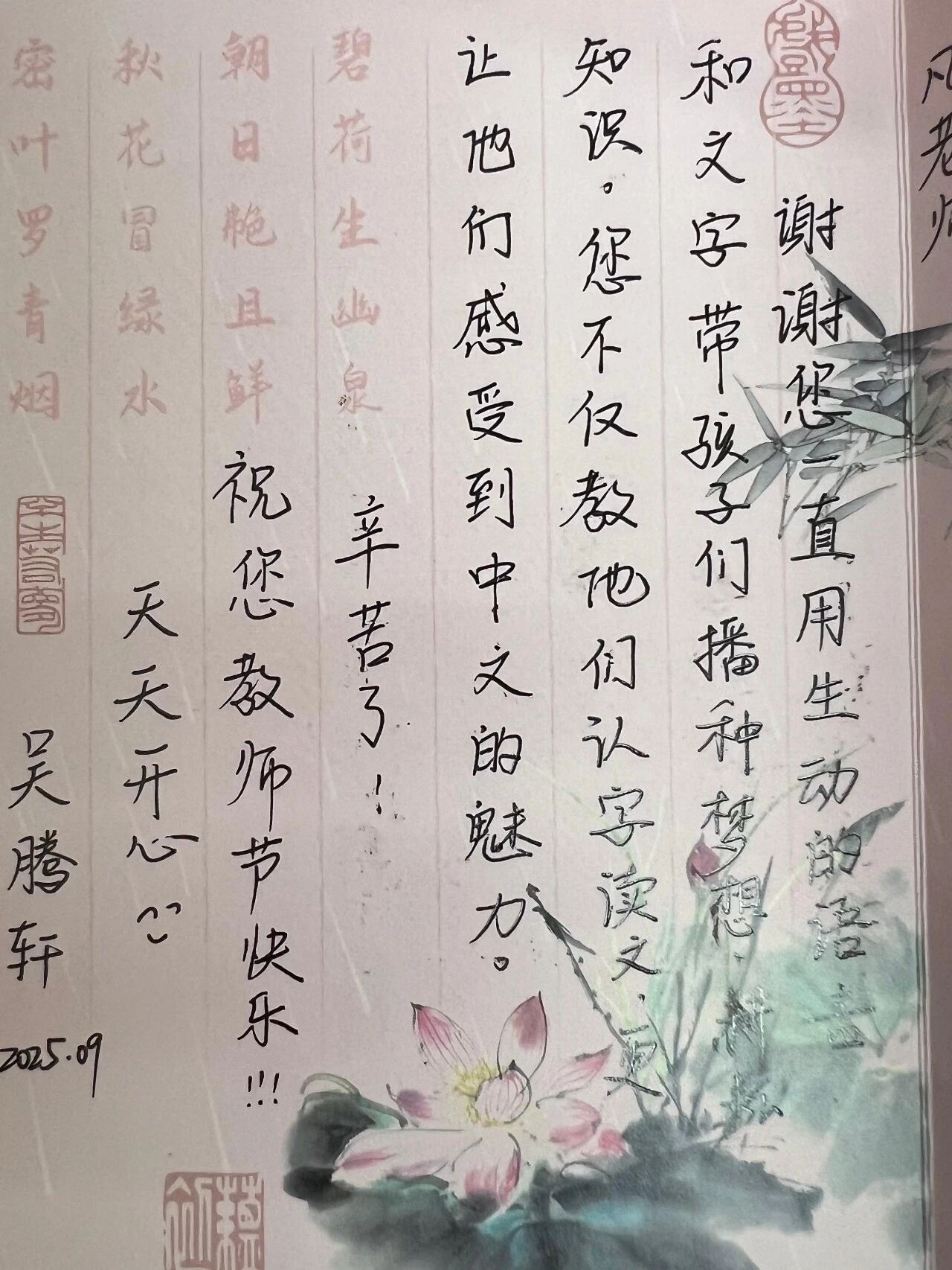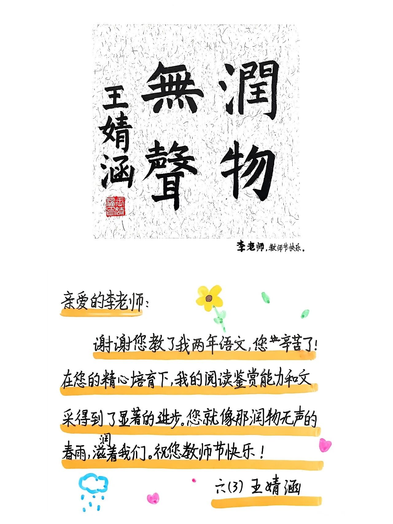 师恩难忘,同学们以情为墨、以心为纸:书信里的一句祝贺、贺卡与黑板上的一幅画作、诗歌里的一段抒怀,皆是千言万语凝聚而成的感恩之语。