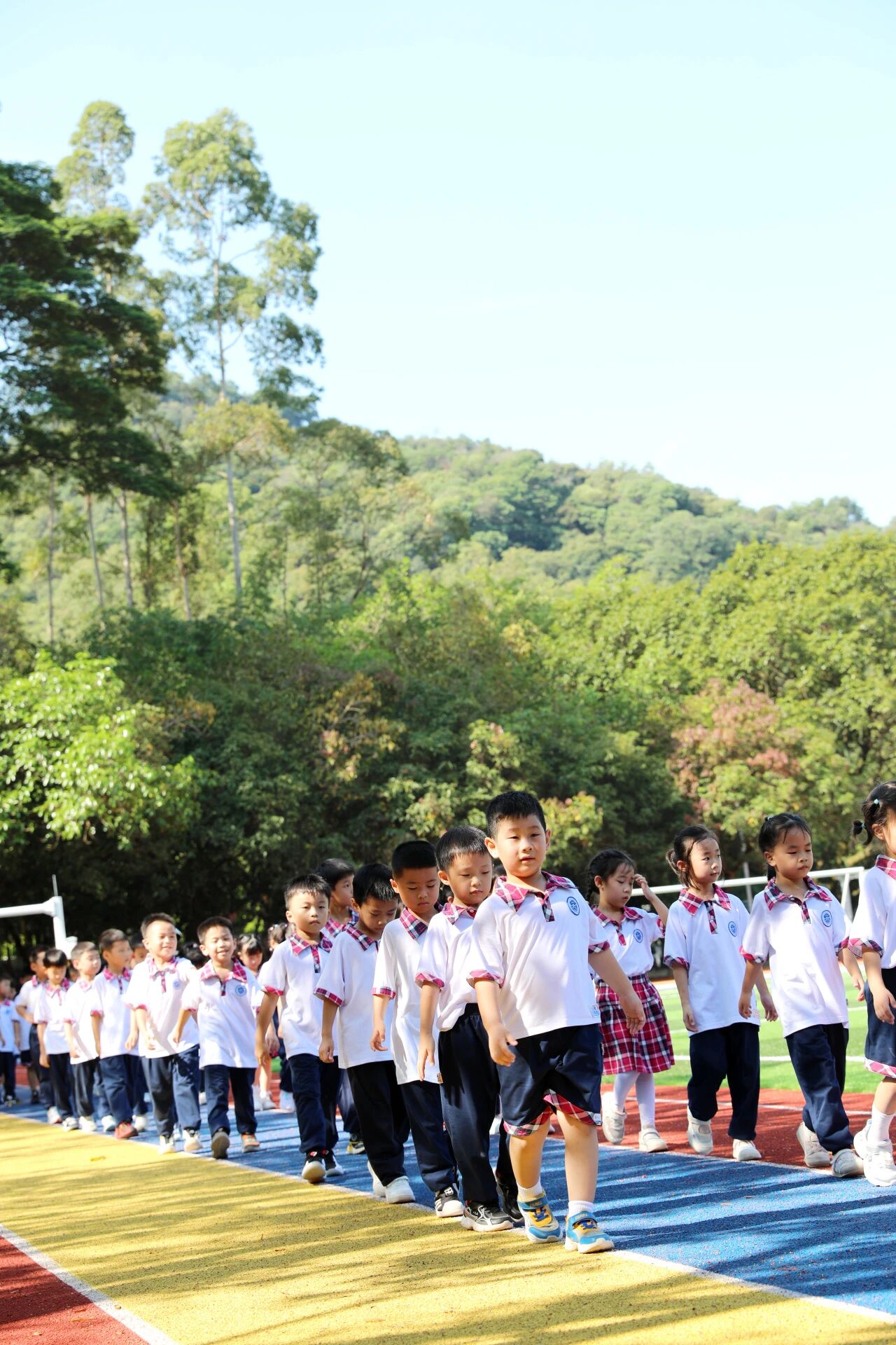 可以在操场上尽情奔跑。