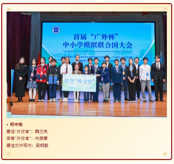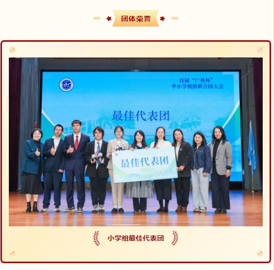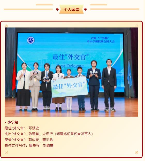 秉持“为学生的终身发展负责,培养走向世界的现代人”的办学宗旨,我校积极搭建国际化实践平台,助力学子拓宽全球视野。近日,首届“广外杯”中小学模拟联合国大会在广东外语外贸大学大学城校区圆满落幕。本次大会创新采用“学段分类+双语分组”赛制,小学、初中、高中各学段均同步设置中文场与英文场,208名“少年外交官”分场竞技。我校12名学子征战小学组英文场与中文场,4名学子征战初中组中文场,他们凭借扎实的学术储备、出色的双语表达与卓越的协作能力脱颖而出,一举斩获团体与个人多项重磅奖项,用实力诠释了白云外国语中小学学子的综合素养与世界胸怀!