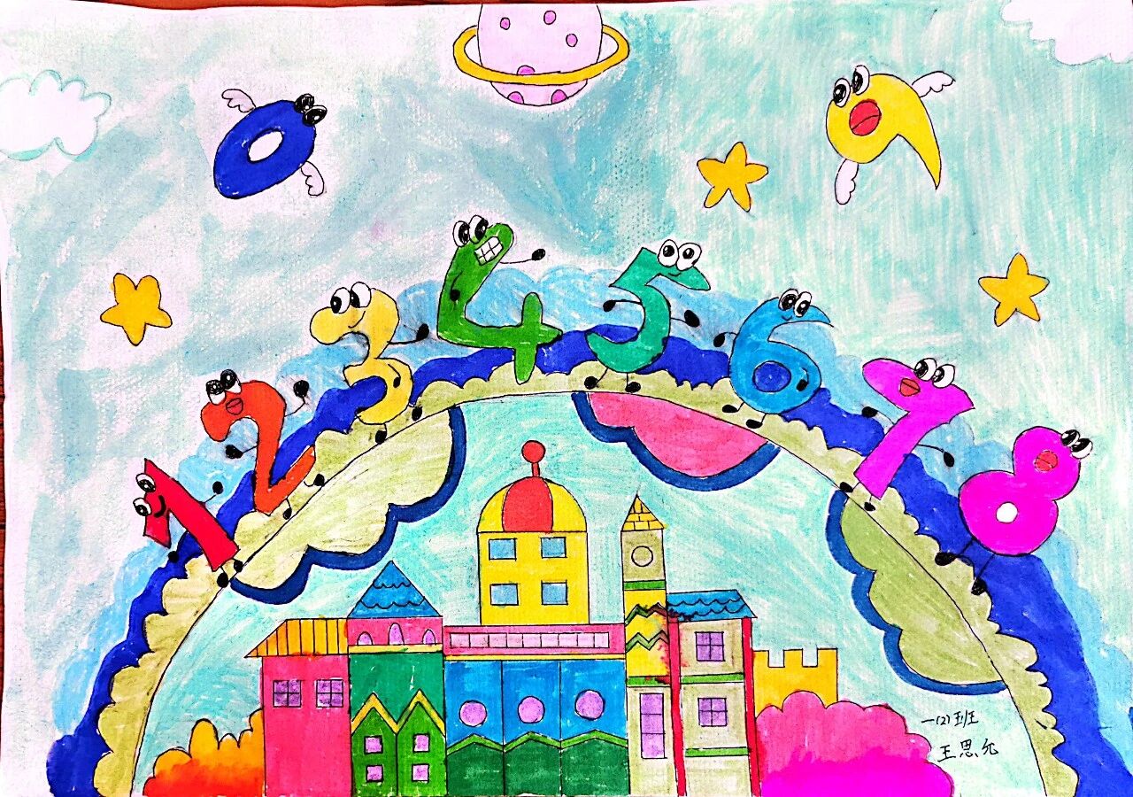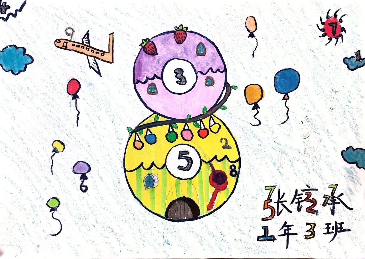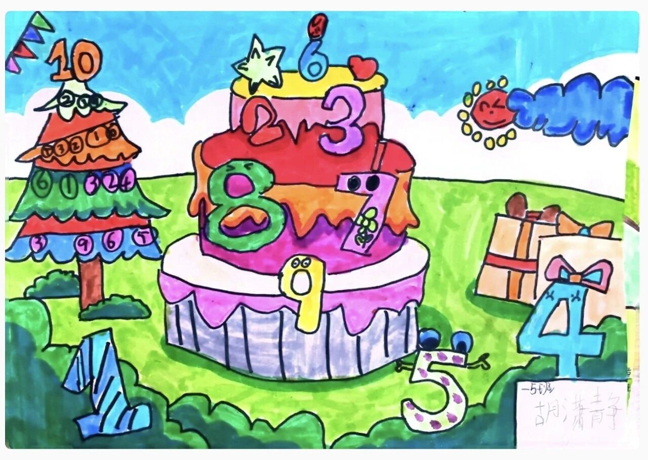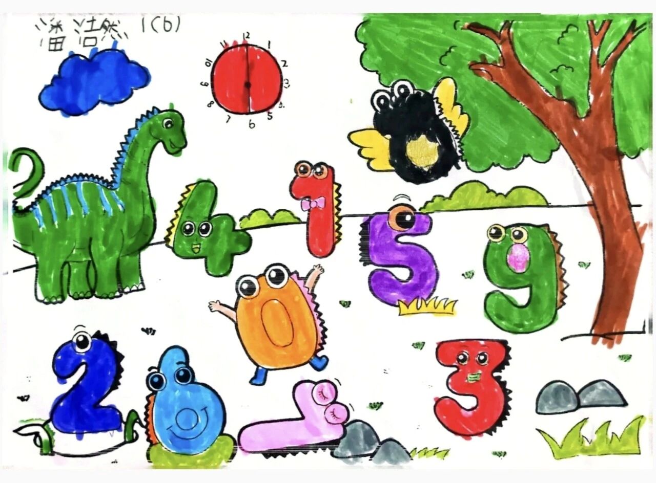 一年级的小朋友们以数字应用场景为创作核心,用绘画、剪贴等多样形式,将门牌号、公交车号、钟表数字等生活元素融入作品。他们不仅精心布局、搭配色彩,还细心标注了数字用途及发现的“数字小秘密”,用童真视角诠释了数学与生活的紧密联系。一幅幅充满童趣的作品,让数学变得生动可爱。
