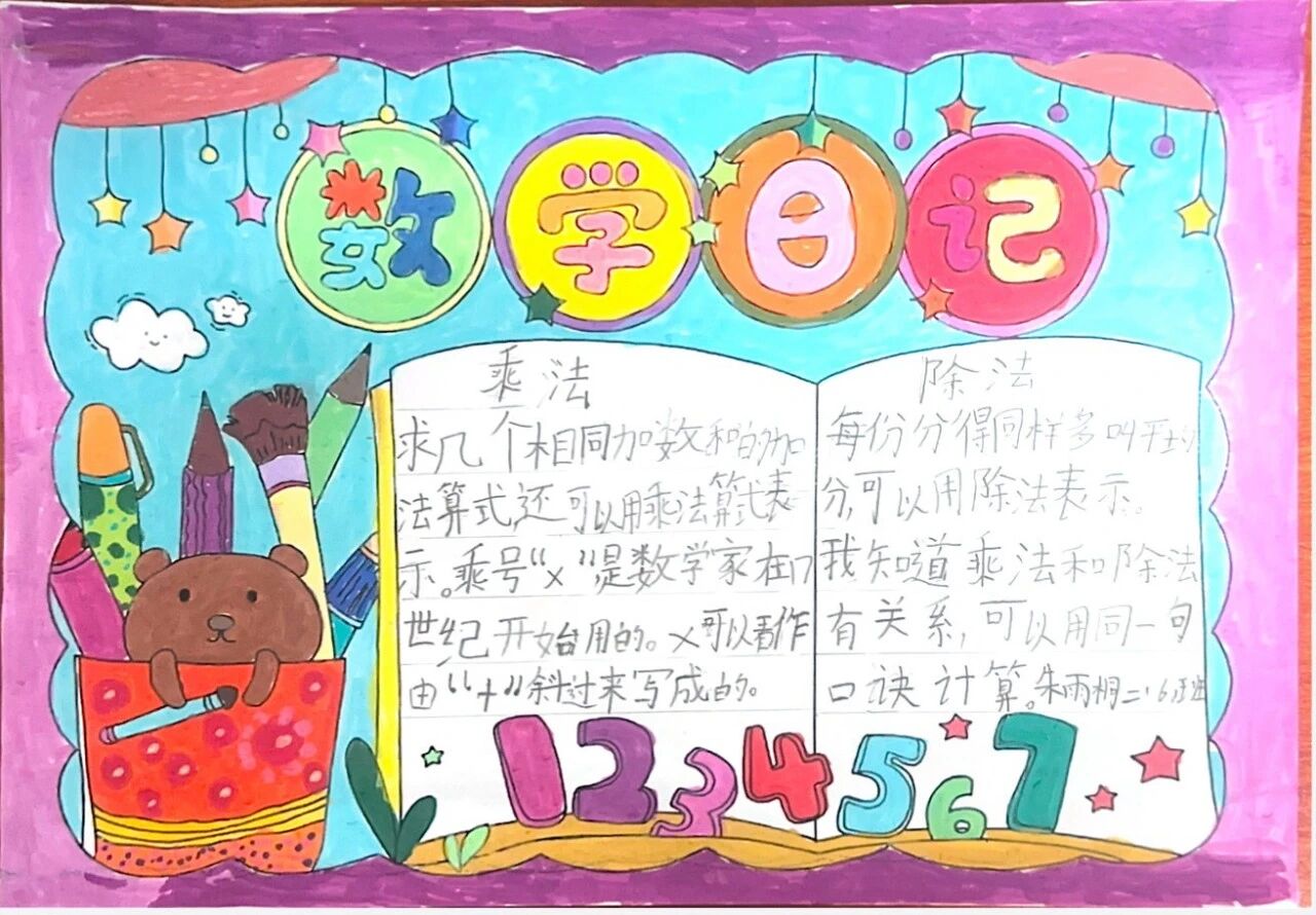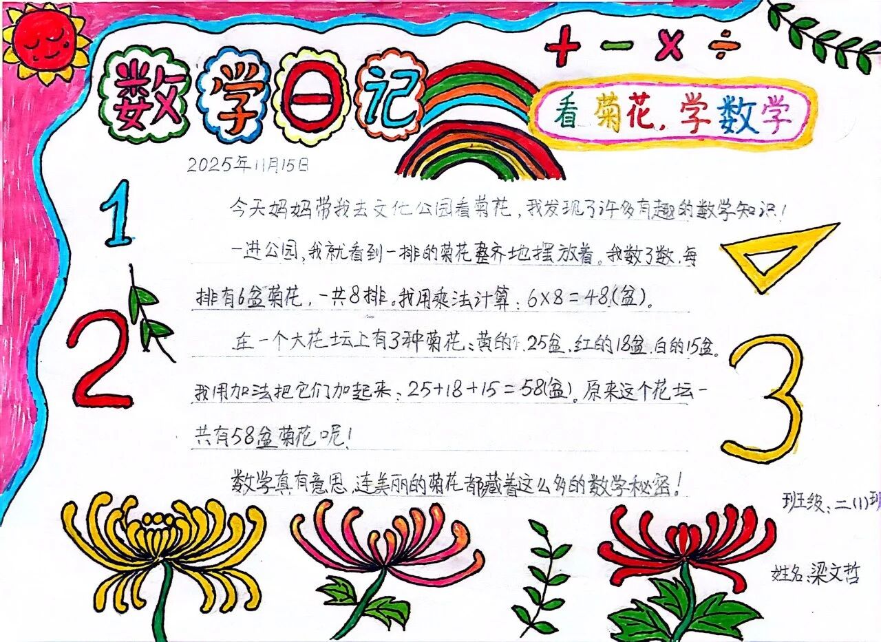 二年级学生以文字为载体,记录生活中的数学现象与课堂所学知识点。日记语句通顺、逻辑清晰,部分同学还配上了简洁形象的插图。从商场购物的价格计算到家庭作息的时间规划,孩子们用数学眼光观察生活,用文字表达对数学的探索热情,展现了扎实的表达能力与数感素养。
