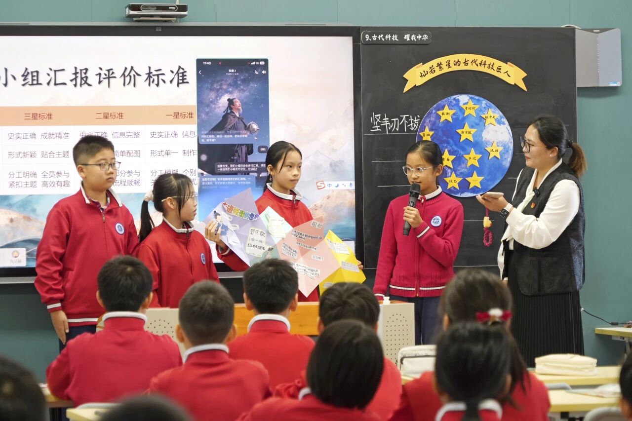 道法组肖又赫老师以五(3)班为授课对象,带来《灿若繁星的古代科技巨人》。学生课前分组搜集各领域科技名人史料,课堂上以多元形式精彩分享,充分展现自主学习能力。课程融合AI数字人互动技术,通过搭建“科技名人堂”、撰写颁奖词等环节,提炼出先贤坚持不懈、求真务实、甘于奉献等精神内核。师生沉浸式对话古今,厚植家国情怀,响应习近平总书记“让青年才俊成为科技创新主力军”的号召,让科技报国的种子在少年心中生根发芽。