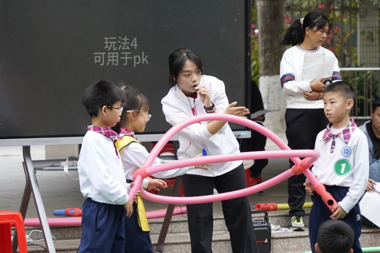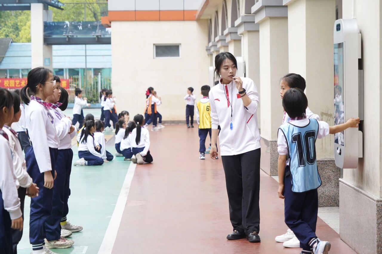 体育组胡馨月老师在架空层开展《AI 赋能立定跳远发展下肢力量 —— 星际跳跃训练营》教学。本课程以太空主题为牵引,聚焦三年级学生下肢力量发展,依托AI技术打造沉浸式体育课堂,引导学生自主探究、小组合作。课堂设置泡沫棒辅助练习,学生探索新颖玩法,落地快乐体育理念;借助移动大屏幕,引出趣动屏AI教学视频规范动作。收尾以趣动屏自动检测数据量化比拼,替代主观评判。课程以AI赋能体育教学,响应青少年体质提升需求,培育科学素养与探究精神。
